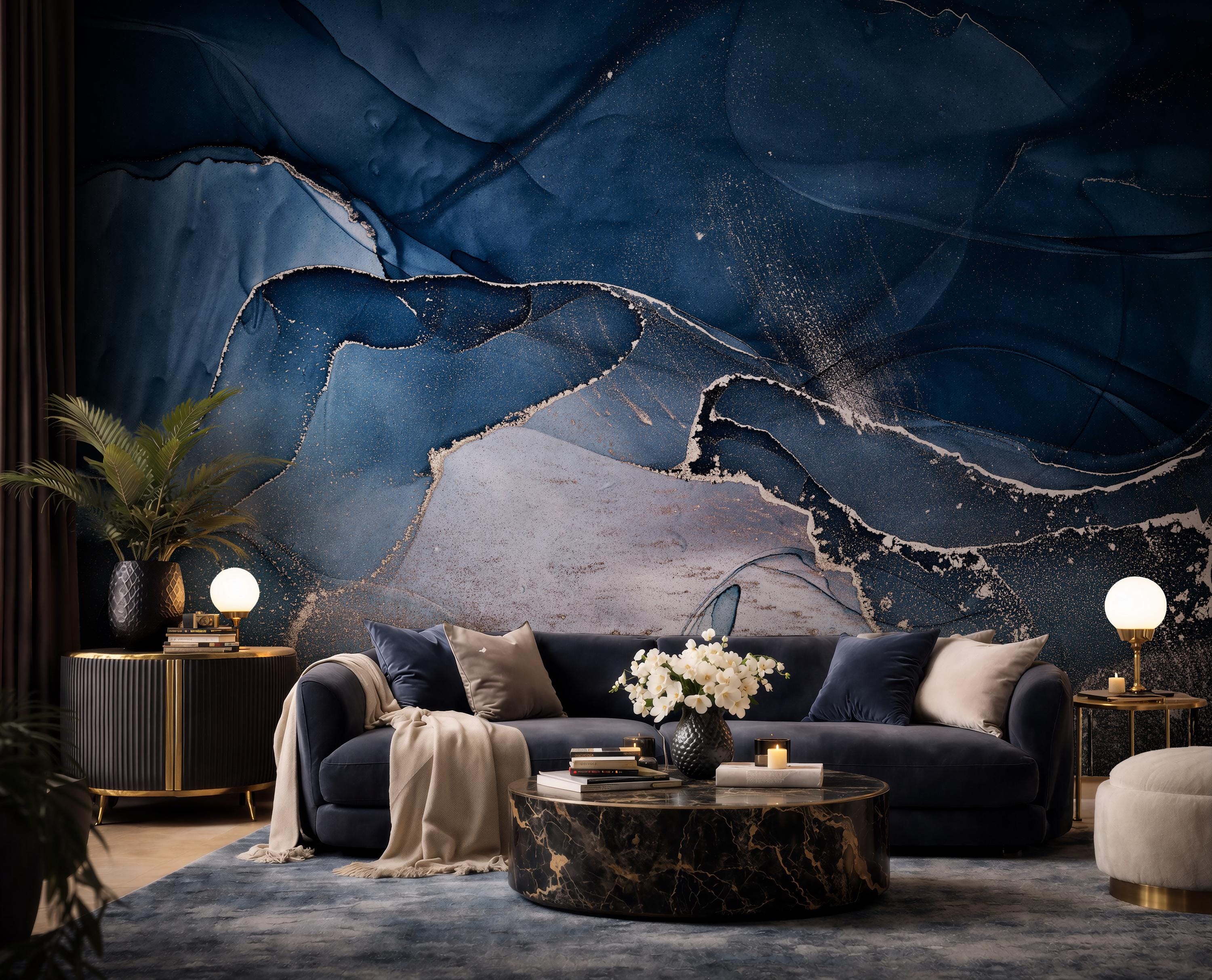 Transform your space into a luxurious sanctuary with our stunning navy blue marble wallpaper. This captivating mural features a harmonious blend of deep blues and calming whites, brought to life with delicate silver veins that shimmer across the design. The fluid, abstract patterns create a sophisticated and modern atmosphere, making it a perfect statement piece for a bedroom, living room, or a chic home office.