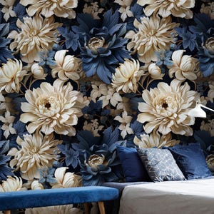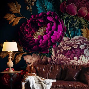 Transform your space into a dramatic and sophisticated sanctuary with our stunning dark floral wallpaper! This captivating mural features a lush array of large, vibrant blooms in shades of red, orange, and pink, set against a rich, dark background. The artistic, moody color palette and intricate details give it a luxurious feel, making it a powerful focal point for a bedroom, living room, or dining area.