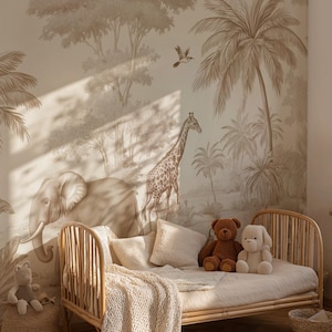 Transform your child's room into a charming and playful farm adventure with our adorable wallpaper! This delightful mural features a cast of cute safari and farm animals—including a giraffe, rhino, zebra, and lion cub—enjoying a day out on bicycles and hot air balloons. The whimsical, hand-drawn style and soft, muted tones create a happy and inspiring space, perfect for sparking your little one's imagination and dreams of exploration.