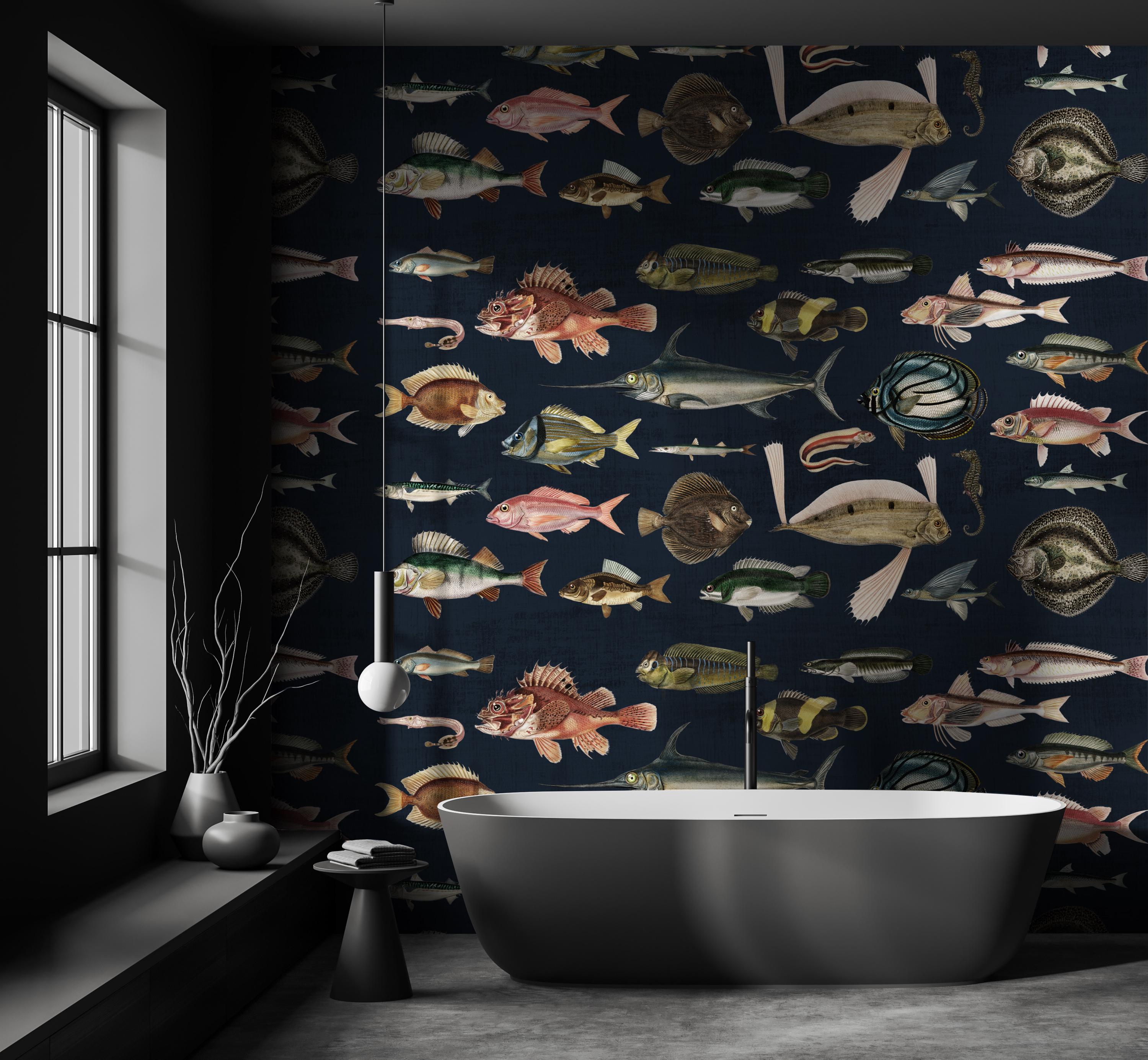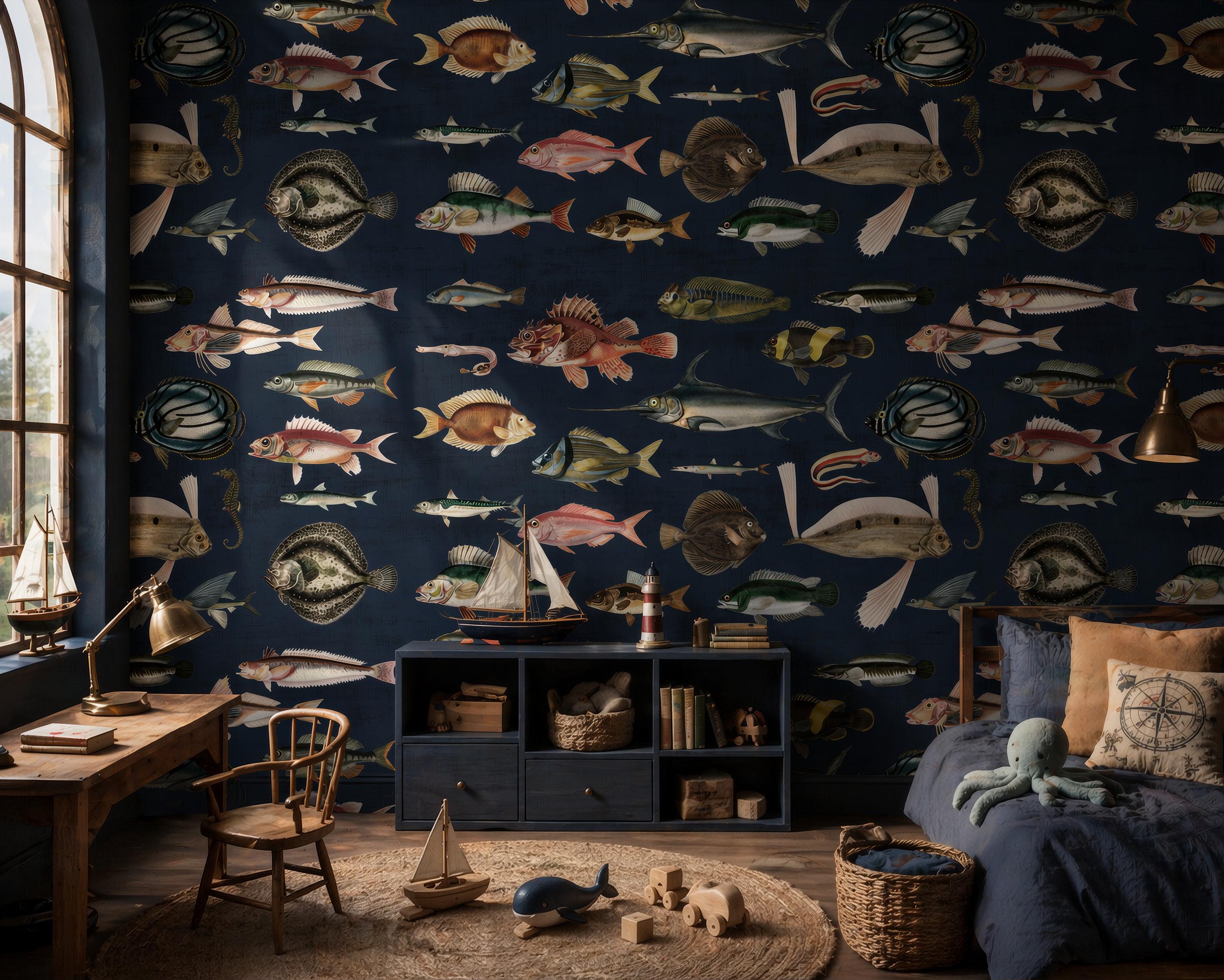 Vintage Fish Wallpaper | Dark Blue Ocean Wall Mural | Removable Peel and Stick