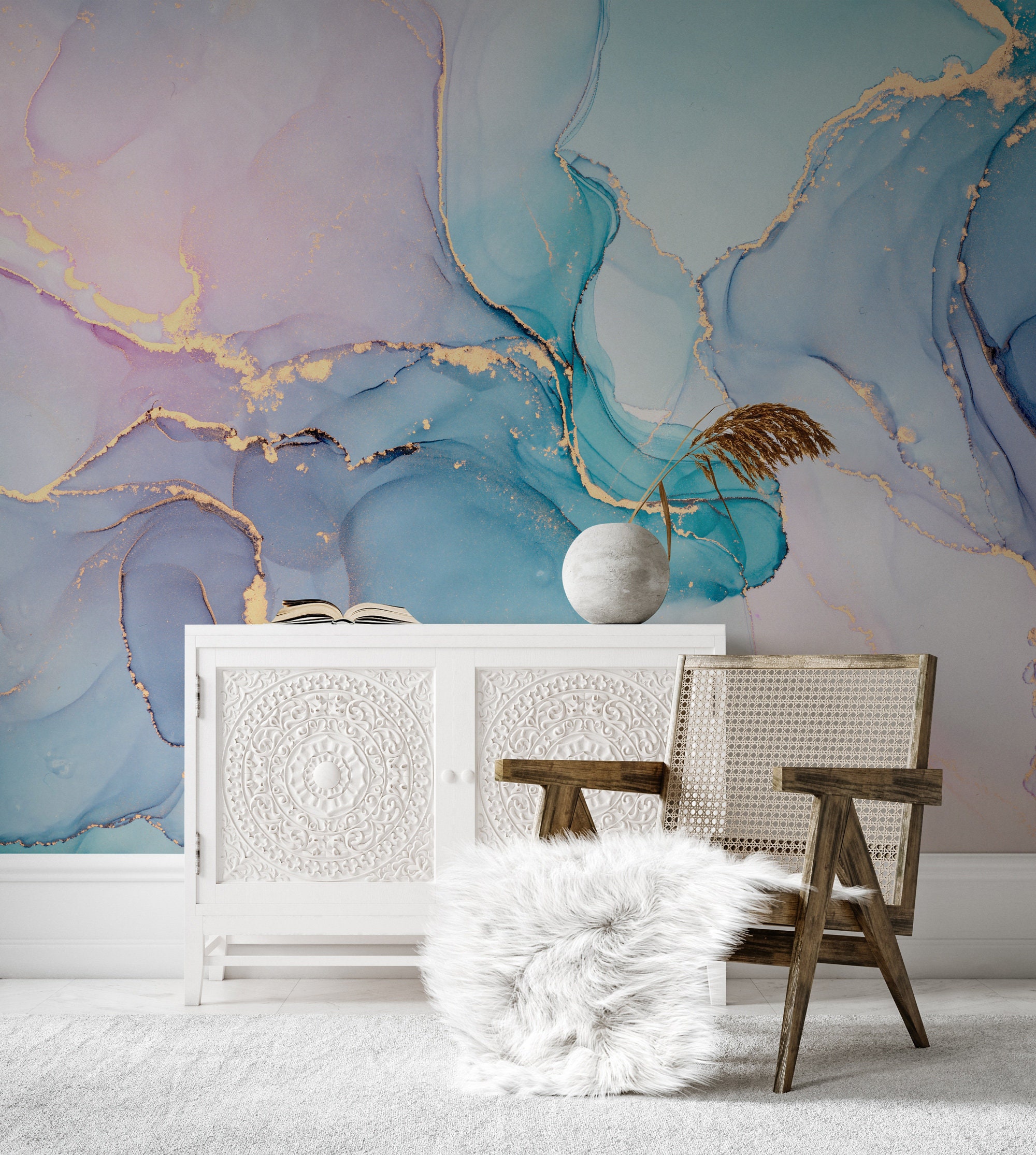 Transform your space into a luxurious sanctuary with our stunning pastel marble wallpaper. This captivating mural features a harmonious blend of soft pinks and calming blues, brought to life with delicate gold veins that shimmer across the design. The fluid, abstract patterns create a sophisticated and modern atmosphere, making it a perfect statement piece for a bedroom, living room, or a chic home office.