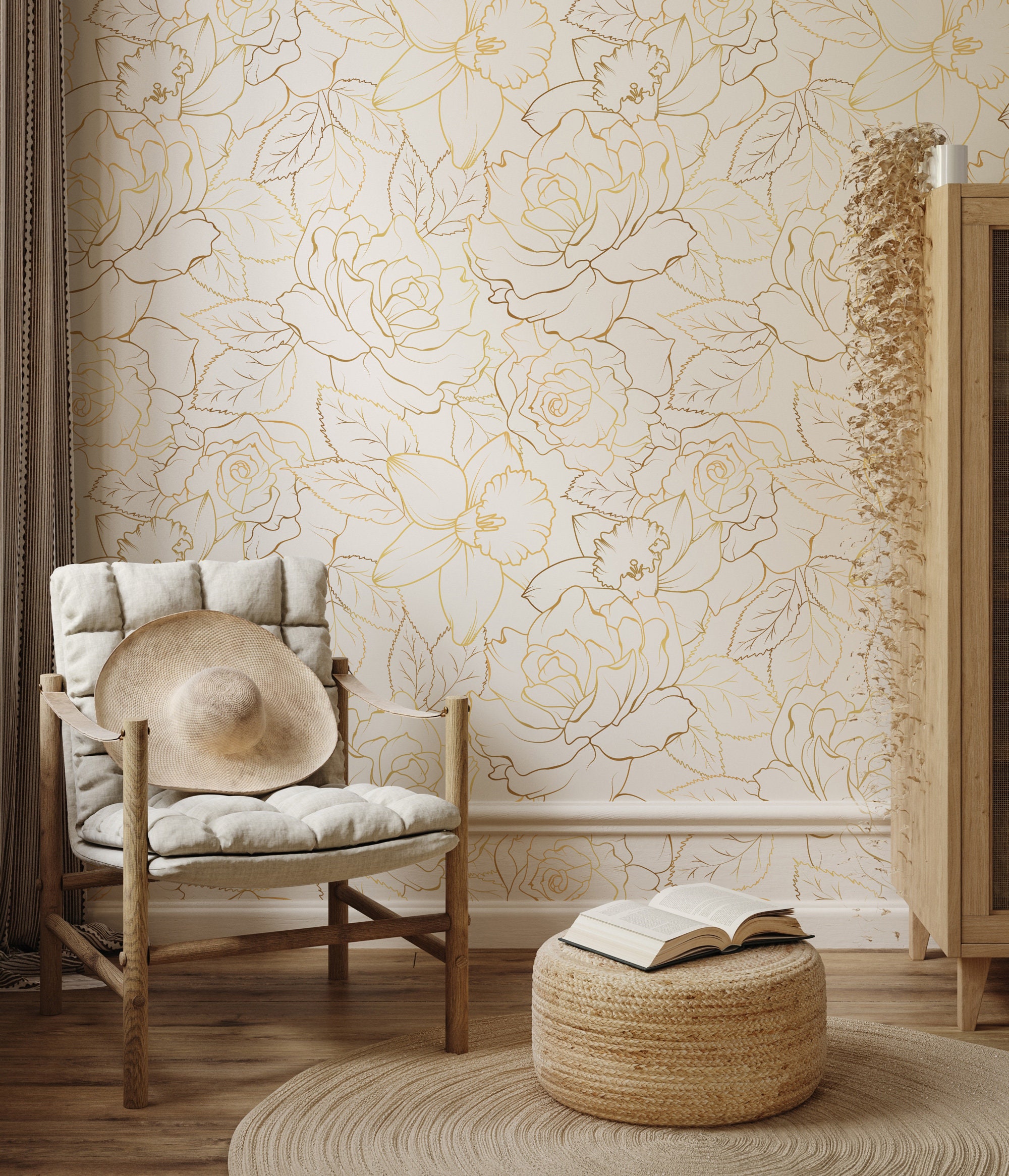 A Touch of Gold: Elegant Line Art Floral Wallpaper for a Modern Home