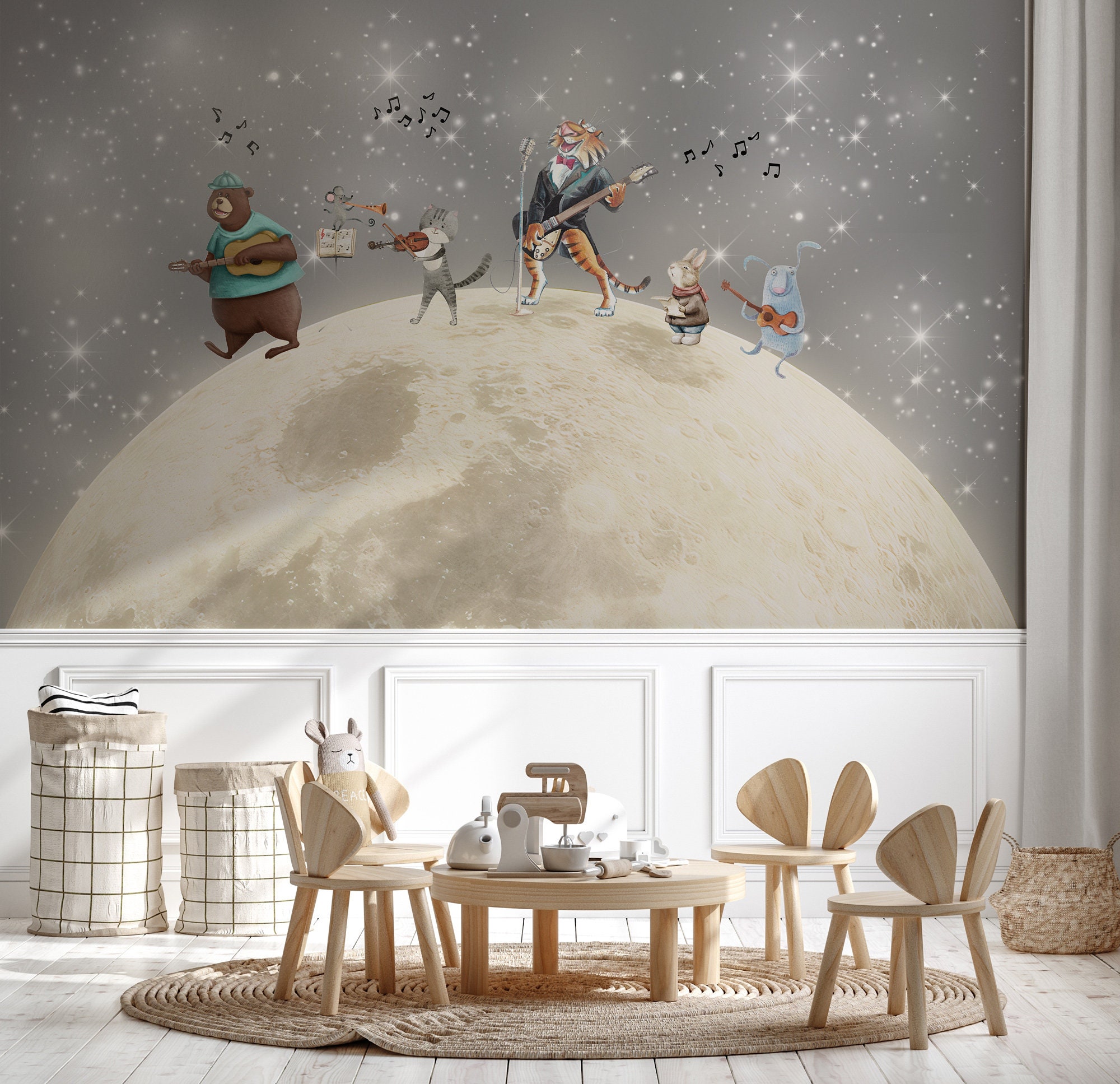 Kids Room Wallpaper Mural: Musical Animals on the Moon, Peel and Stick