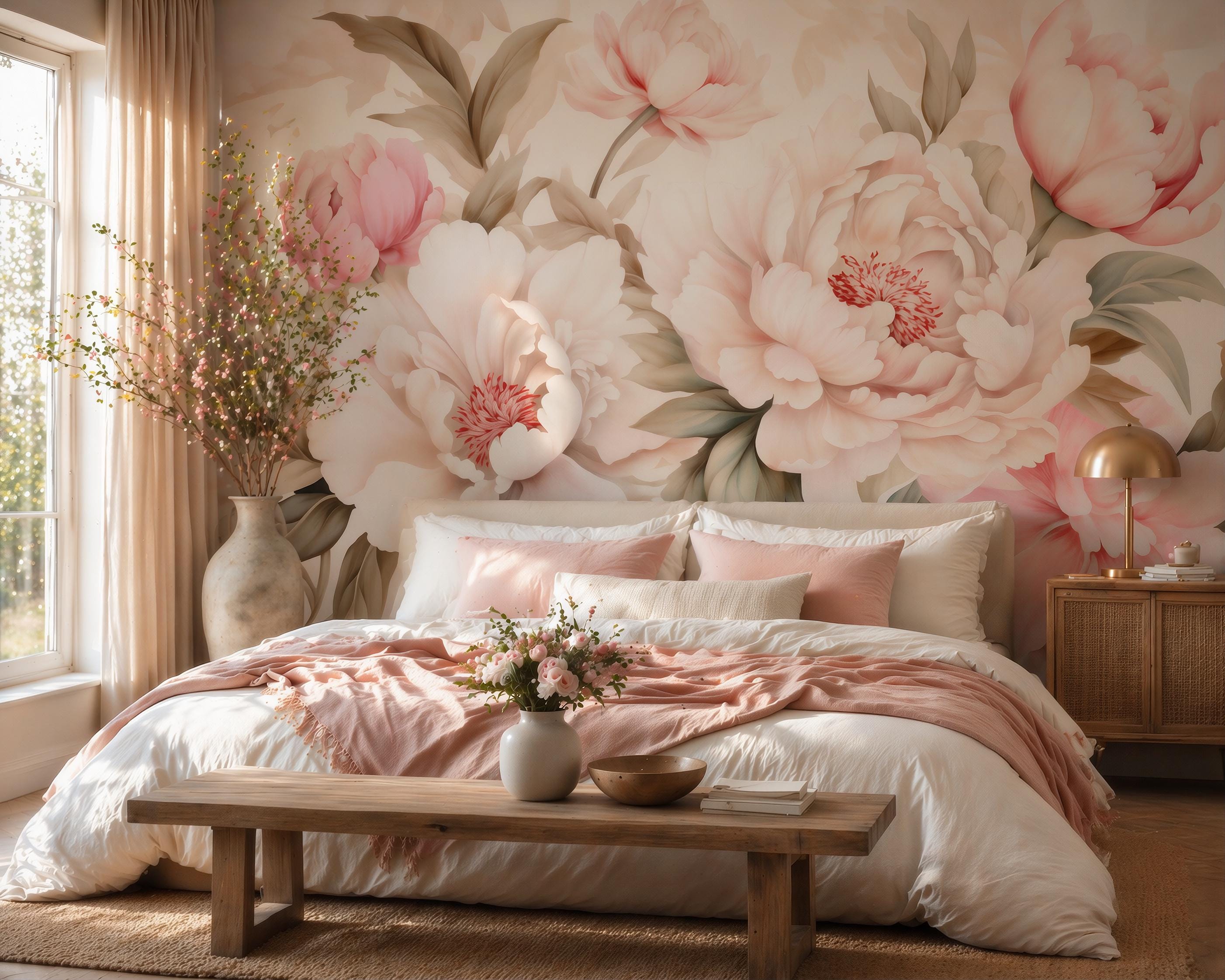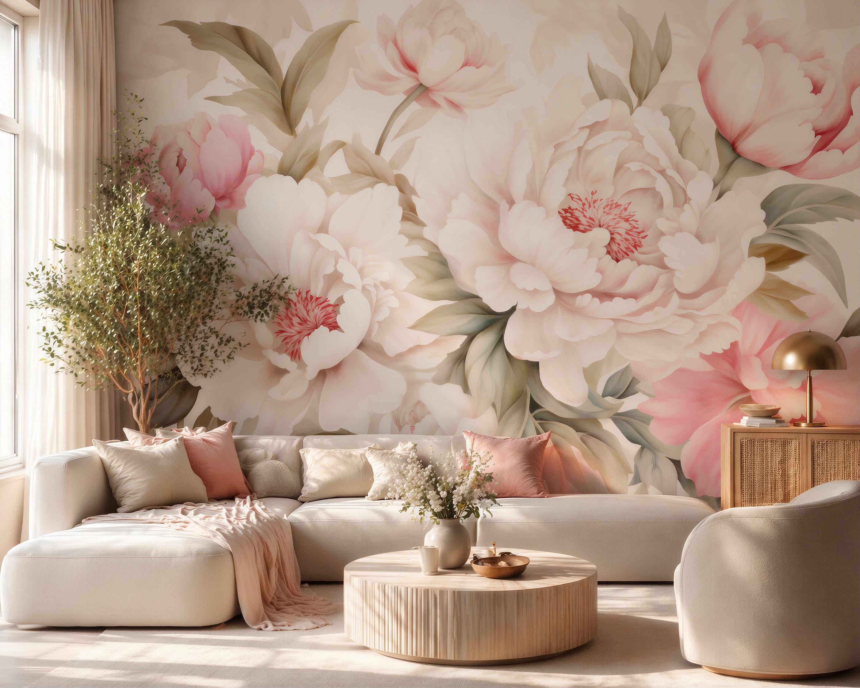 Pastel Peony Wallpaper | Romantic Floral Wall Mural | Soft Pink Wall Decor | Peel and Stick