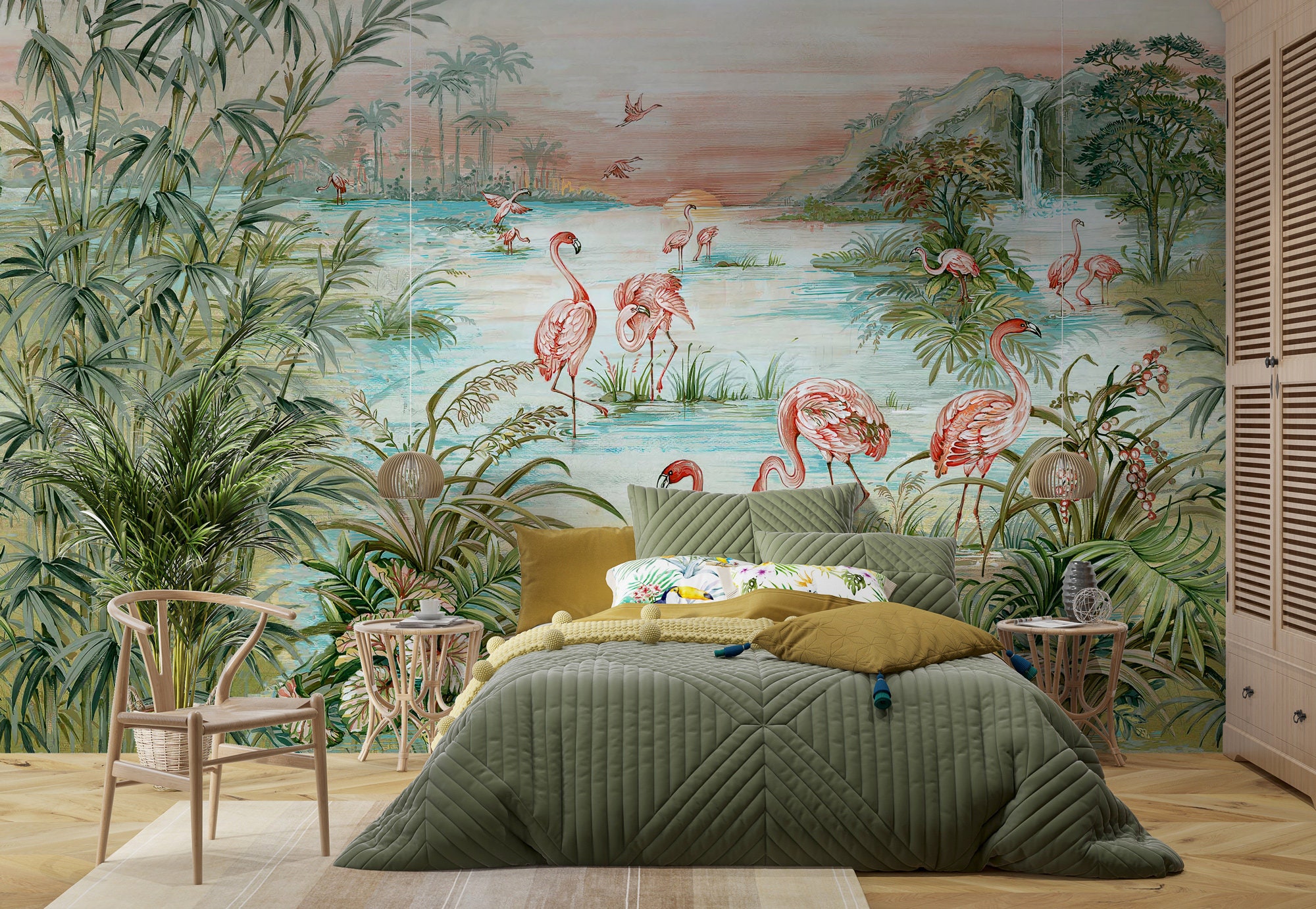 Transform your space into a tranquil tropical paradise with our stunning flamingo wallpaper. This mural captures the serene beauty of an exotic landscape, featuring elegant pink flamingos wading in a calm lake surrounded by lush green bamboo and palm trees under a gentle, sunset-hued sky. The soft, artistic style and calming color palette create a peaceful and sophisticated ambiance, making it a perfect statement piece for a bedroom, living room, or reading nook.