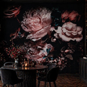 Transform your space into a dramatic and sophisticated sanctuary with our stunning dark floral snake wallpaper! This captivating mural features a lush array of large, blooming peonies in classic black and white, set against a rich, dark background. Intertwined with this botanical beauty are subtle, artistic snake figures, adding a touch of intriguing, gothic elegance. The moody color palette and intricate design make it a powerful focal point for a bedroom, living room, or study.