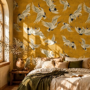 Chinoiserie Crane Wall Mural | Dark Floral Wallpaper | Elegant Bird Wall Art