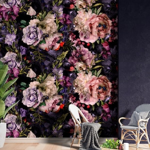Dark Botanical Wallpaper | Moody Floral Wall Mural | Removable Peel and Stick