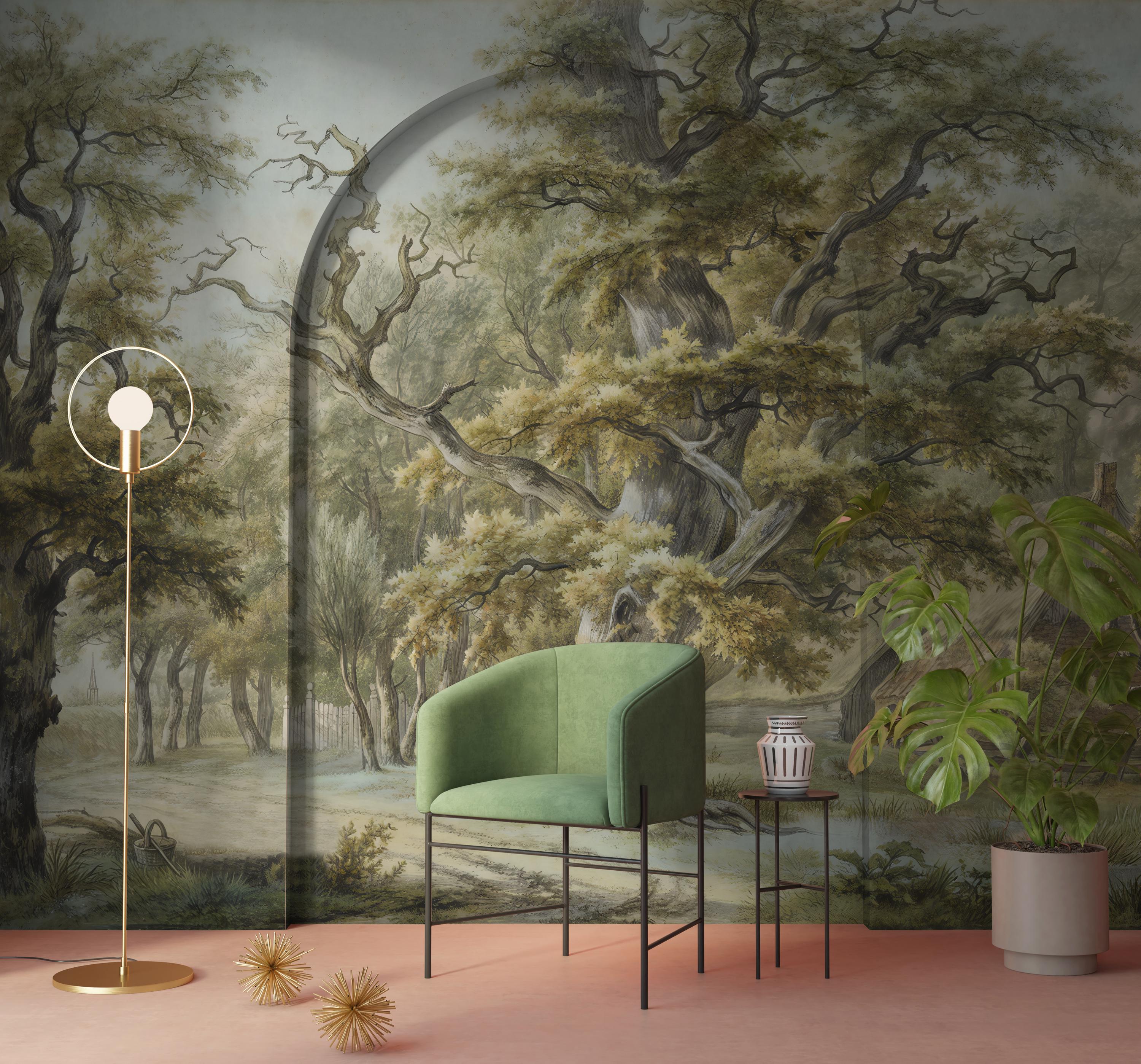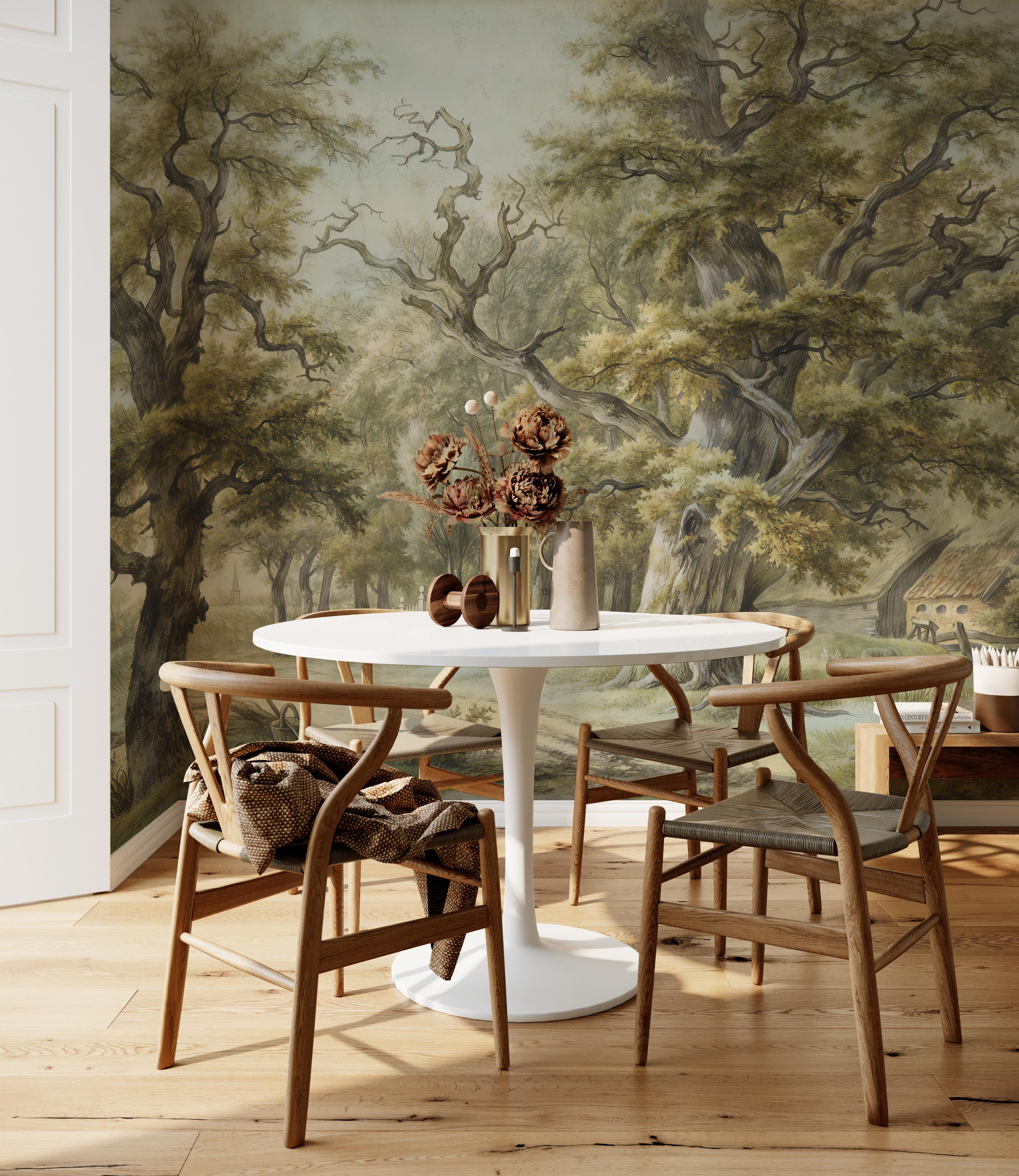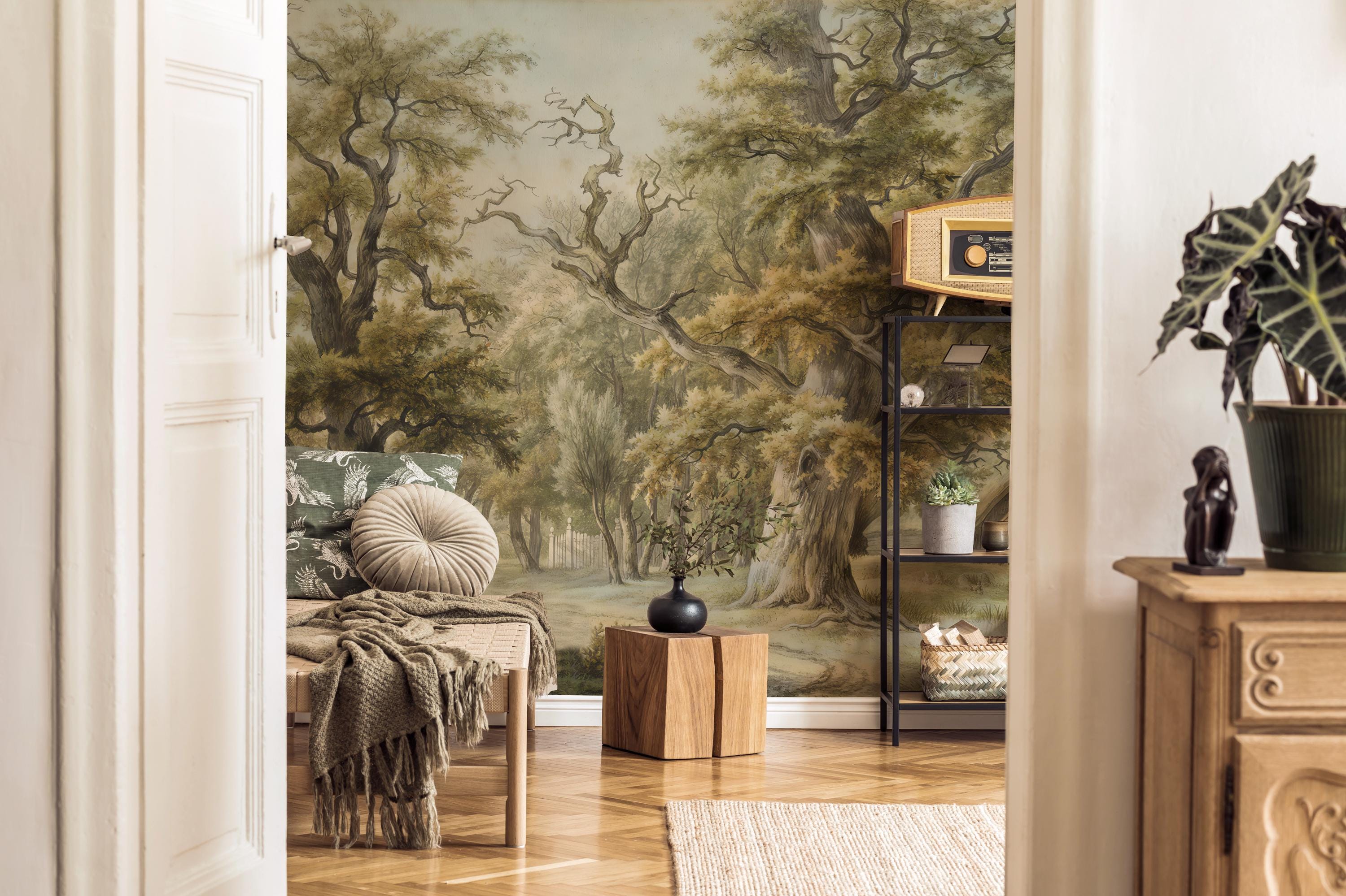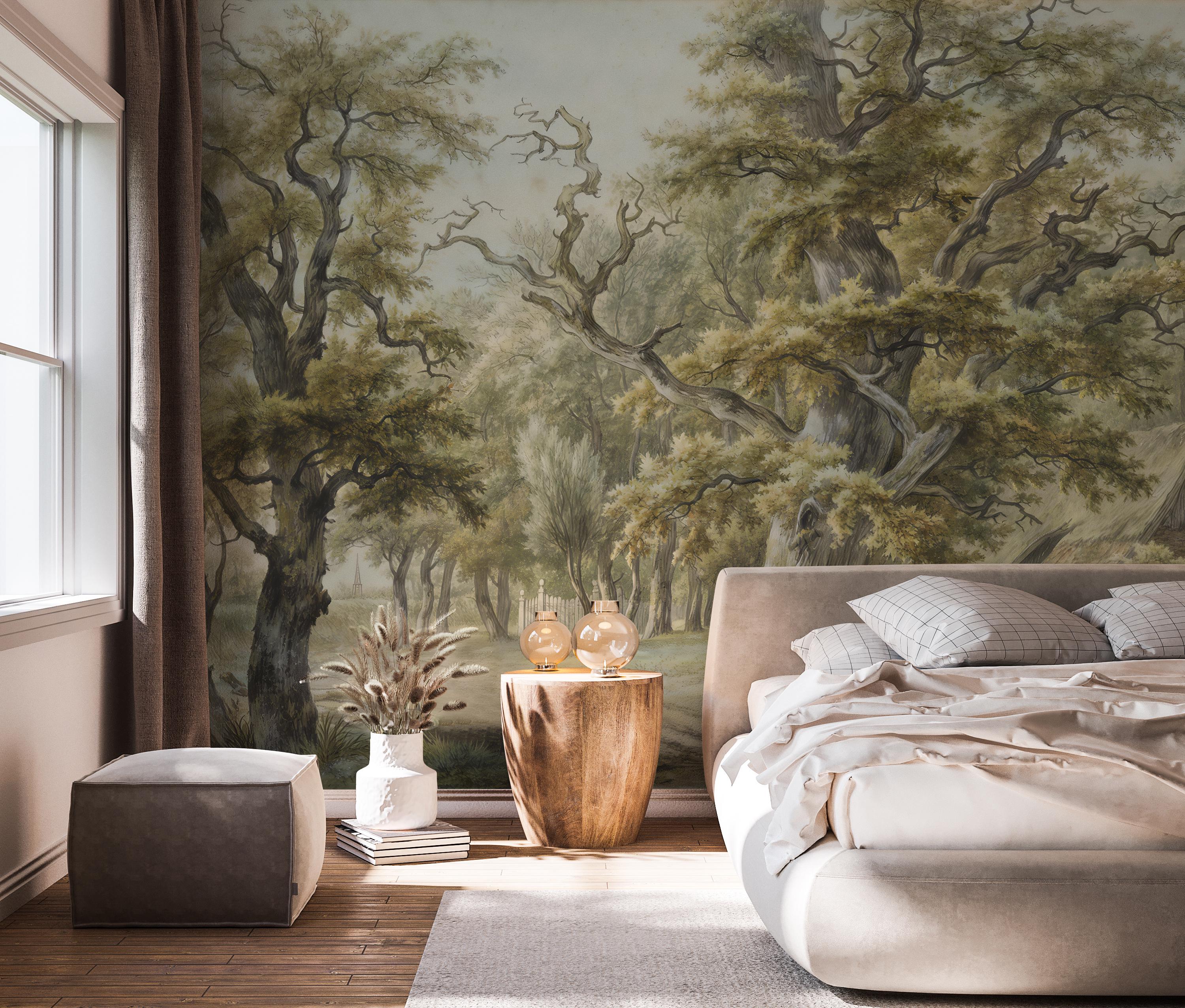 Transform your space into a luxurious and intellectual sanctuary with our stunning classical forest wallpaper. This captivating mural features a painterly, vintage landscape reminiscent of an Old Master's painting, dominated by massive, ancient trees and a deep, misty woodland. The rich, moody tones and artistic style create a sophisticated and artistic atmosphere, making it a perfect statement piece for a dining room, study, or elegant living area.