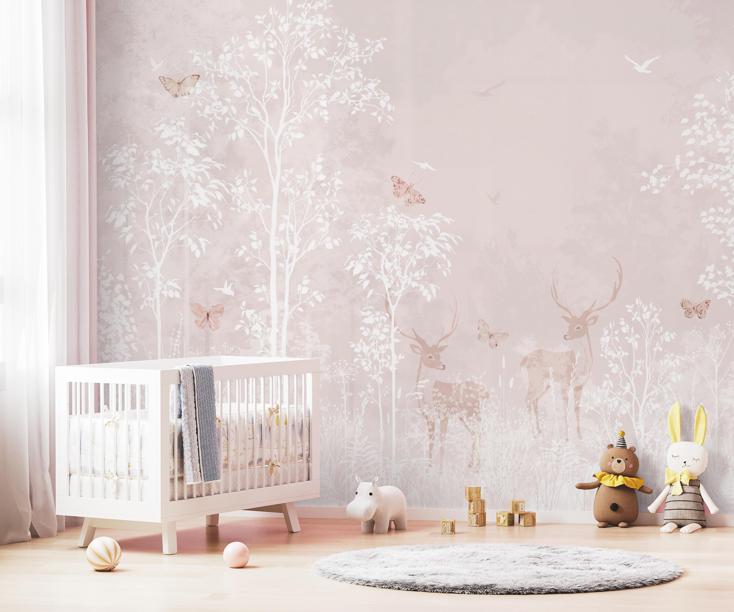 Transform your child's room into a peaceful and enchanting haven with our stunning Pastel Kids Forest Wallpaper. This captivating mural features delicate white trees, elegant deer, and fluttering butterflies against a soft, dreamy pink background. The whimsical, hand-painted style and calming pastel tones create a tranquil atmosphere, making it an ideal choice for a nursery, kids' bedroom, or playroom.