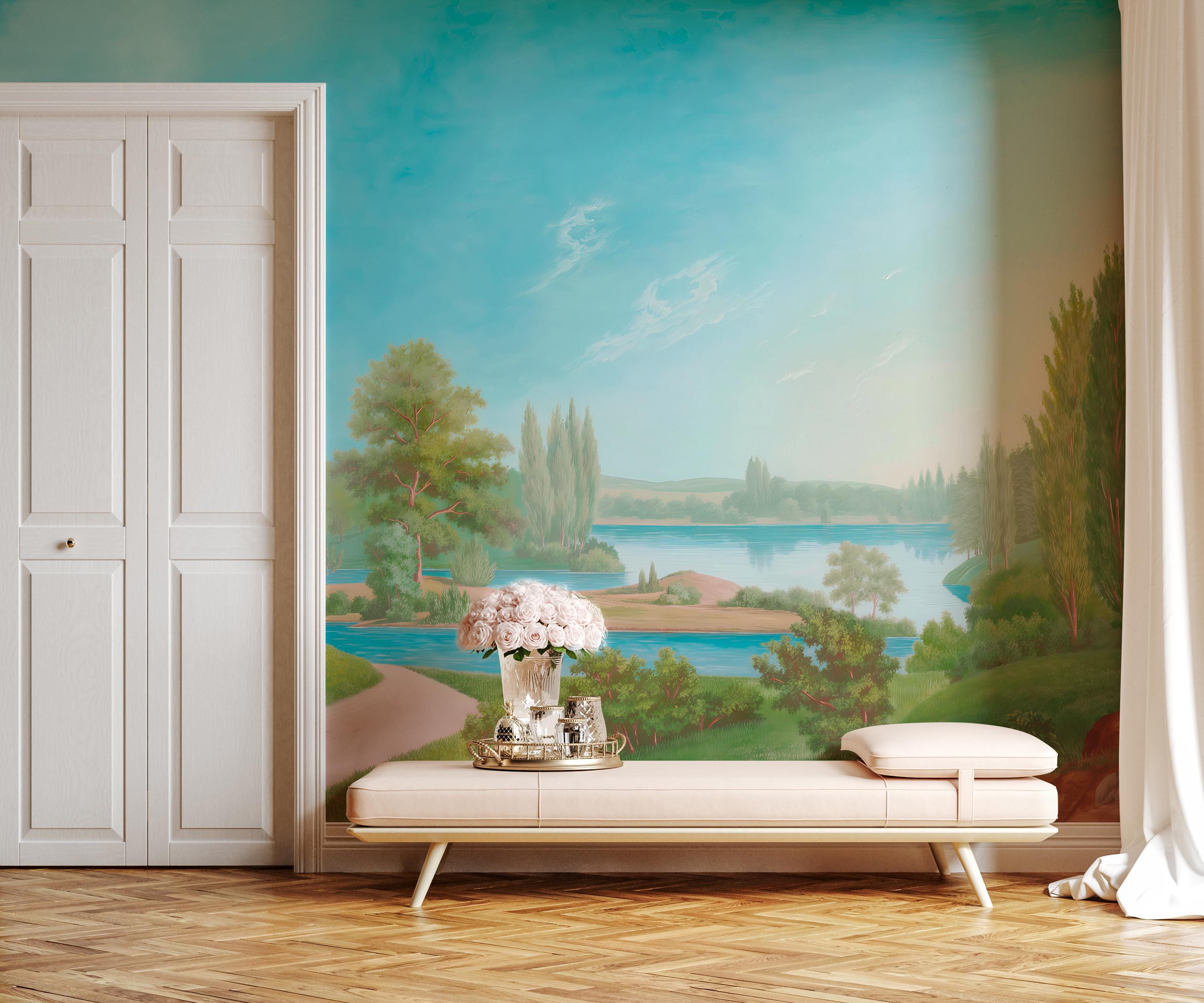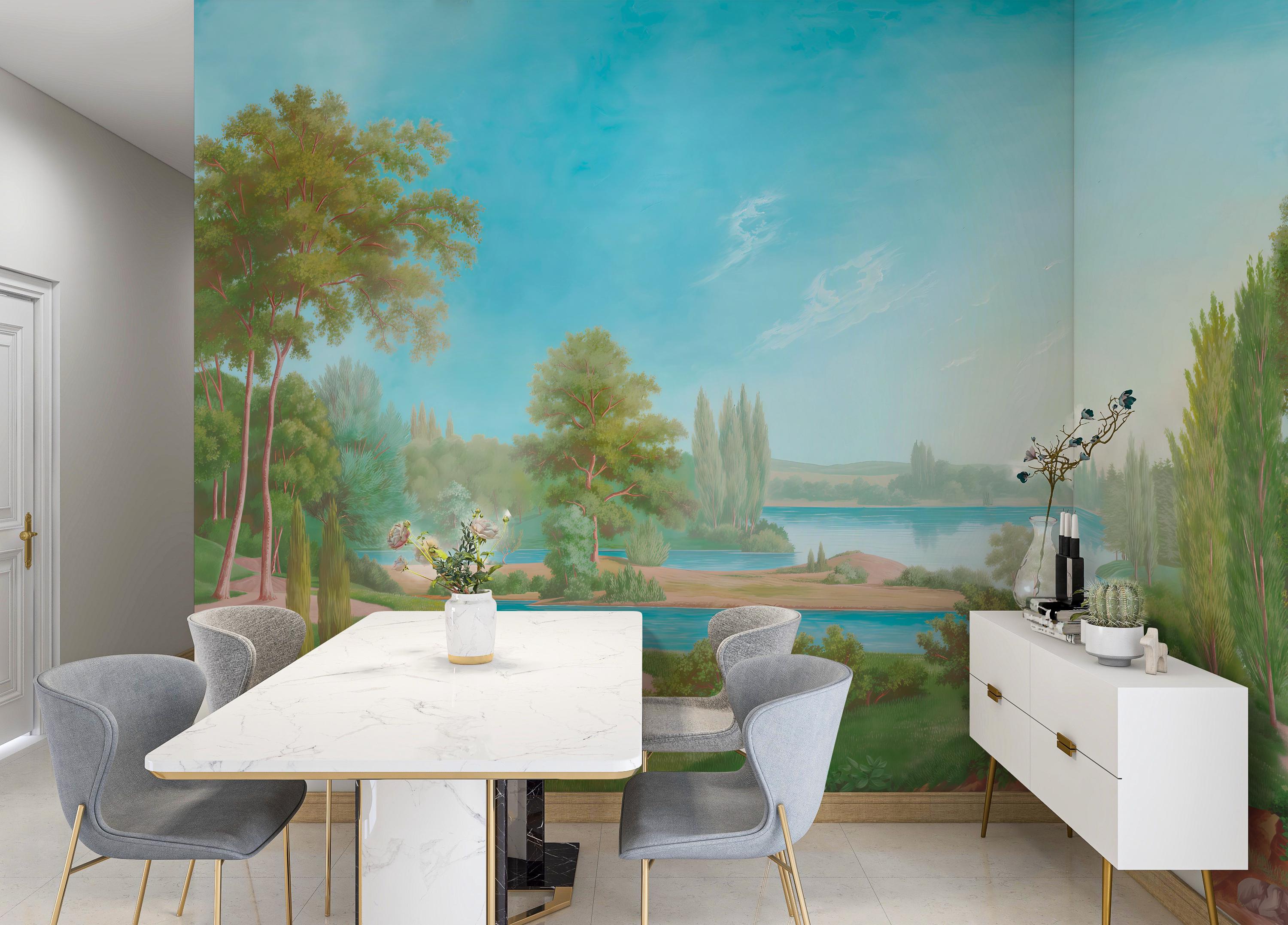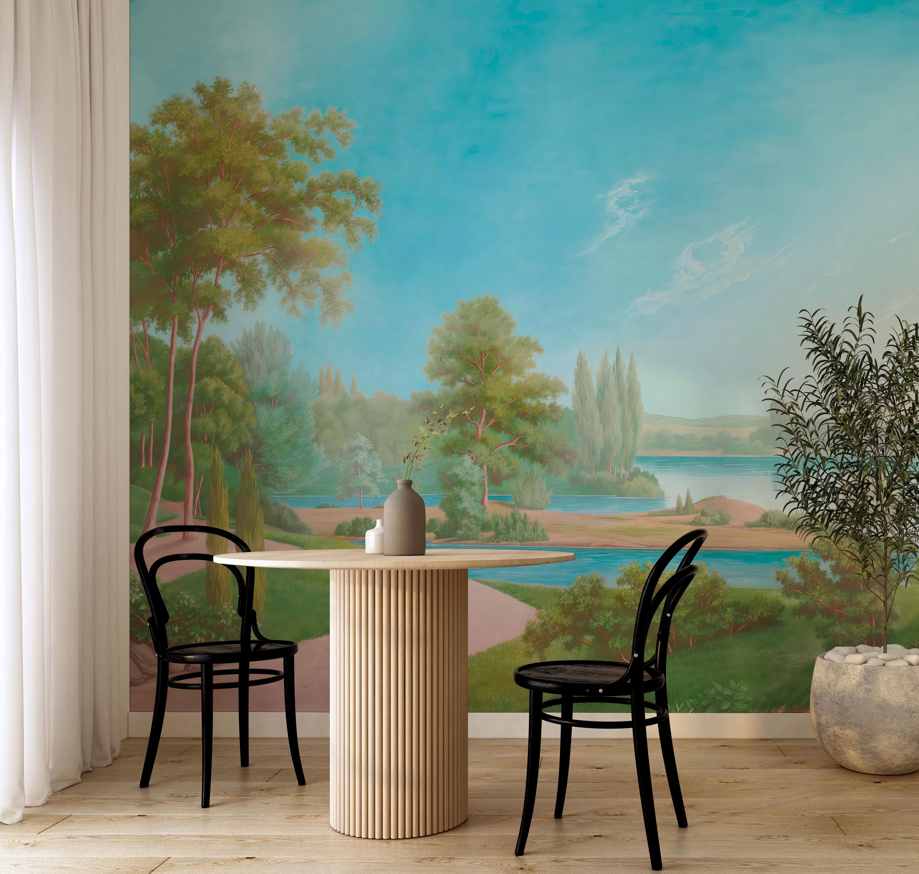 Transform your space into a luxurious and intellectual sanctuary with our stunning classical landscape wallpaper. This captivating mural features a soft, painterly scene of a serene river, lush green trees, and distant hills, reminiscent of 18th-century European landscape paintings. The rich, calming tones and artistic style create a sophisticated and artistic atmosphere, making it a perfect statement piece for a living room, study, or elegant dining area.