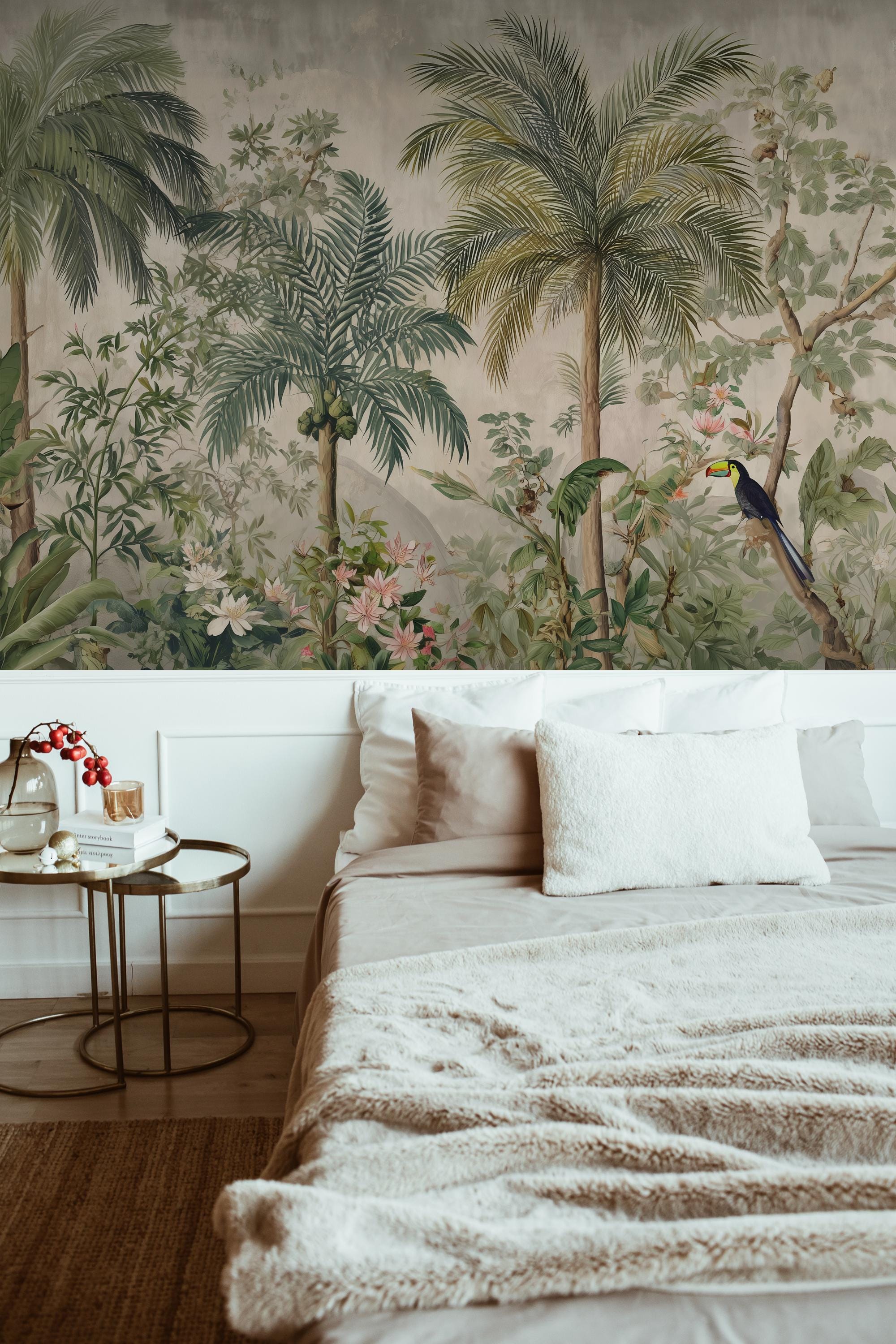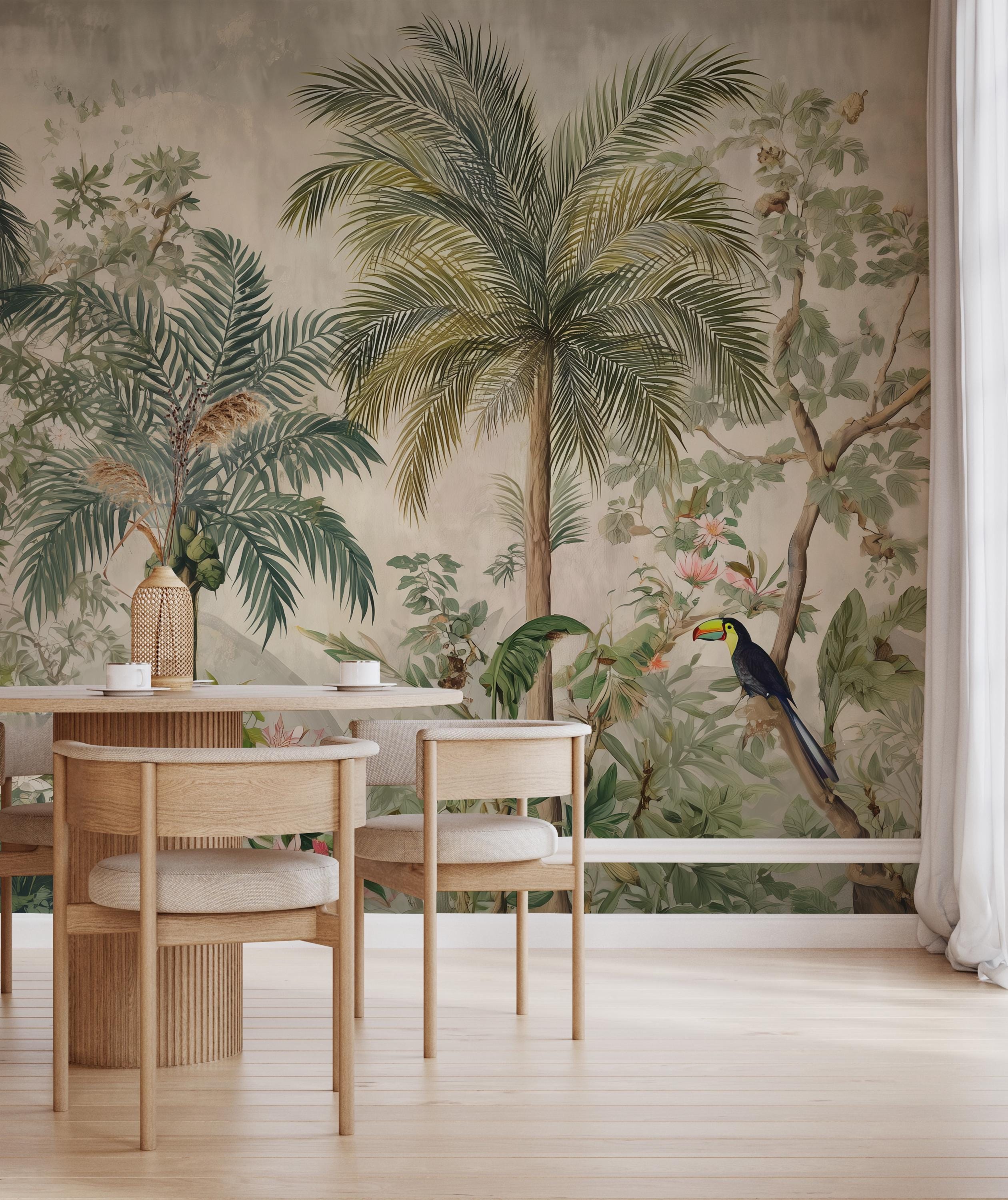 Inspired by hand-painted botanical artworks, this design features graceful palm trees, lush foliage, and subtle exotic details that create a calm yet luxurious tropical atmosphere. The soft color palette and painterly textures make it ideal for timeless interiors that value balance, sophistication, and artistic character.