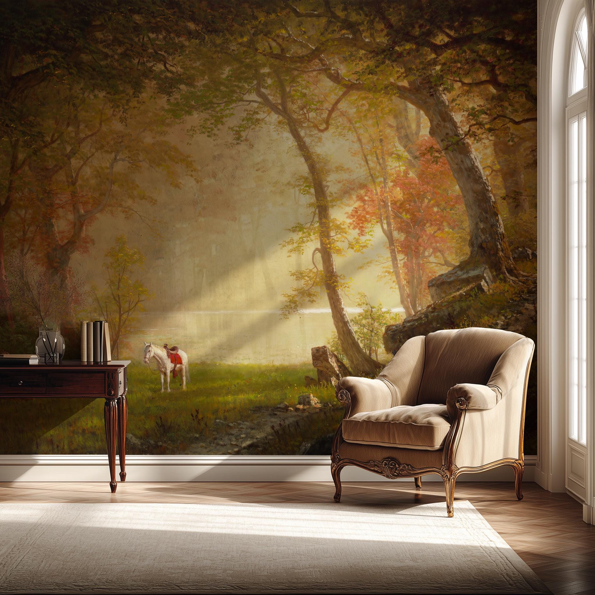 This artwork features a serene forest scene with soft sunlight, majestic trees, and peaceful horses, creating a calm, atmospheric, and emotionally rich space. The painterly details and warm tones give the impression of a hand-painted mural, transforming your wall into a statement piece of fine art.