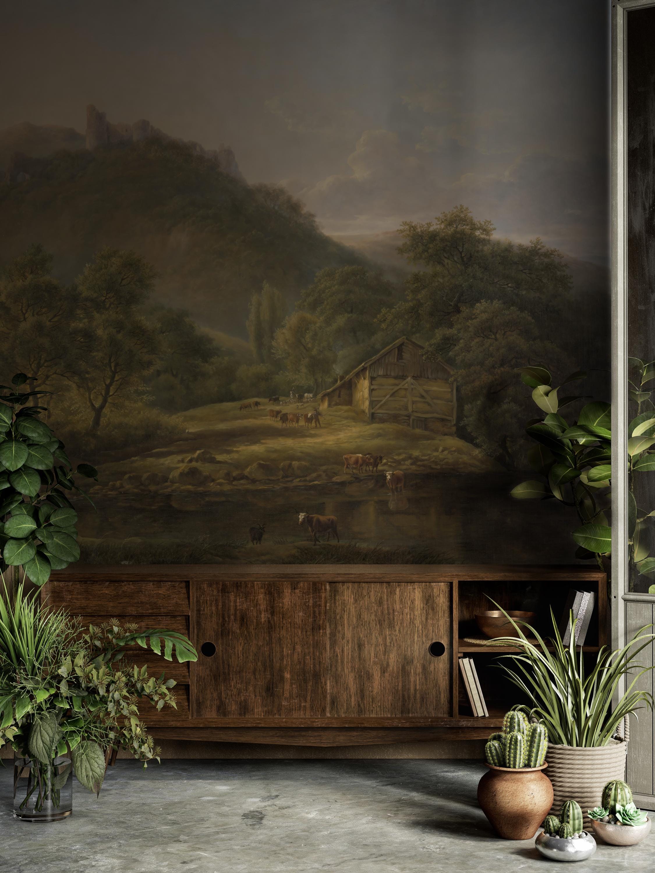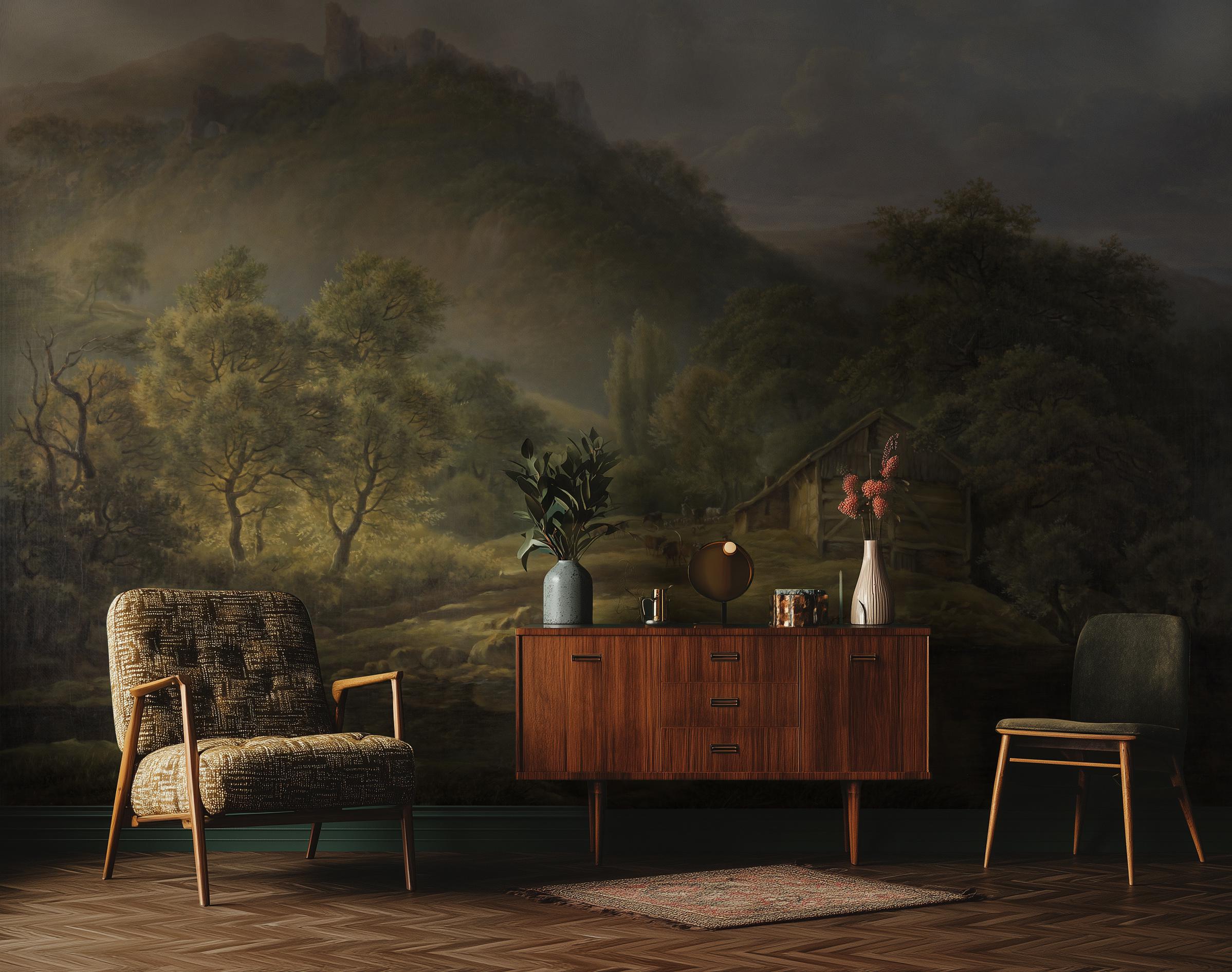 Create a deep, atmospheric interior with this Dark Vintage Landscape Wallpaper Mural, inspired by classical landscape paintings and timeless fine art.