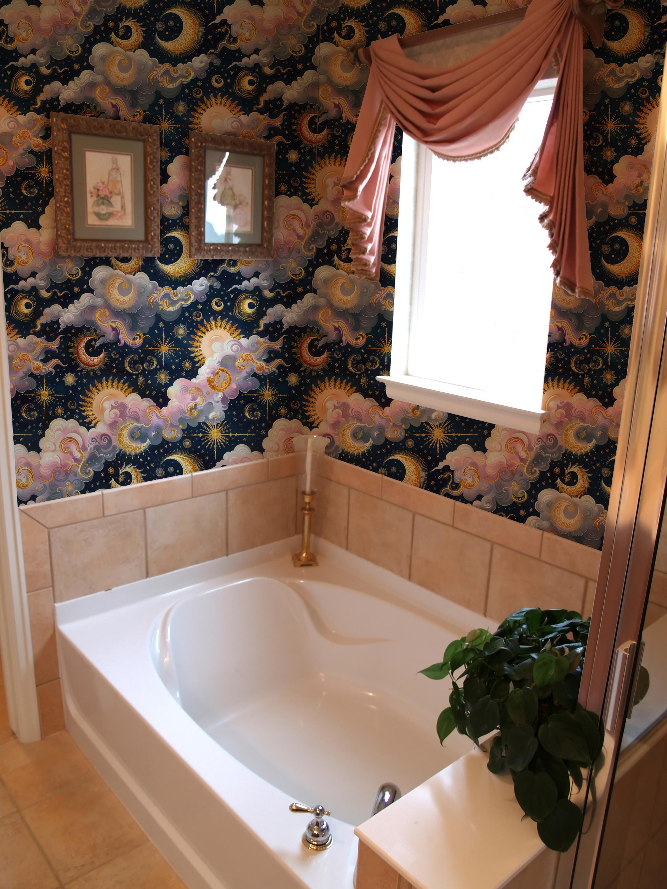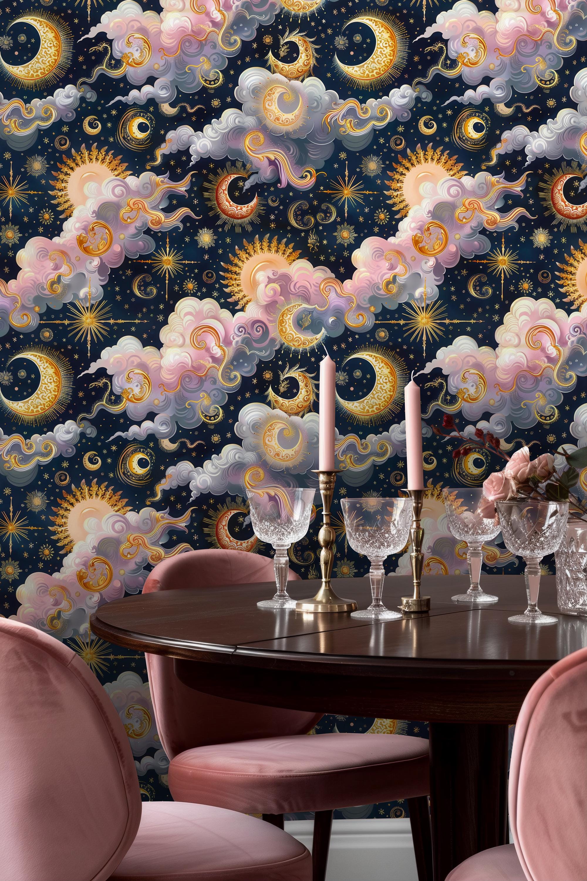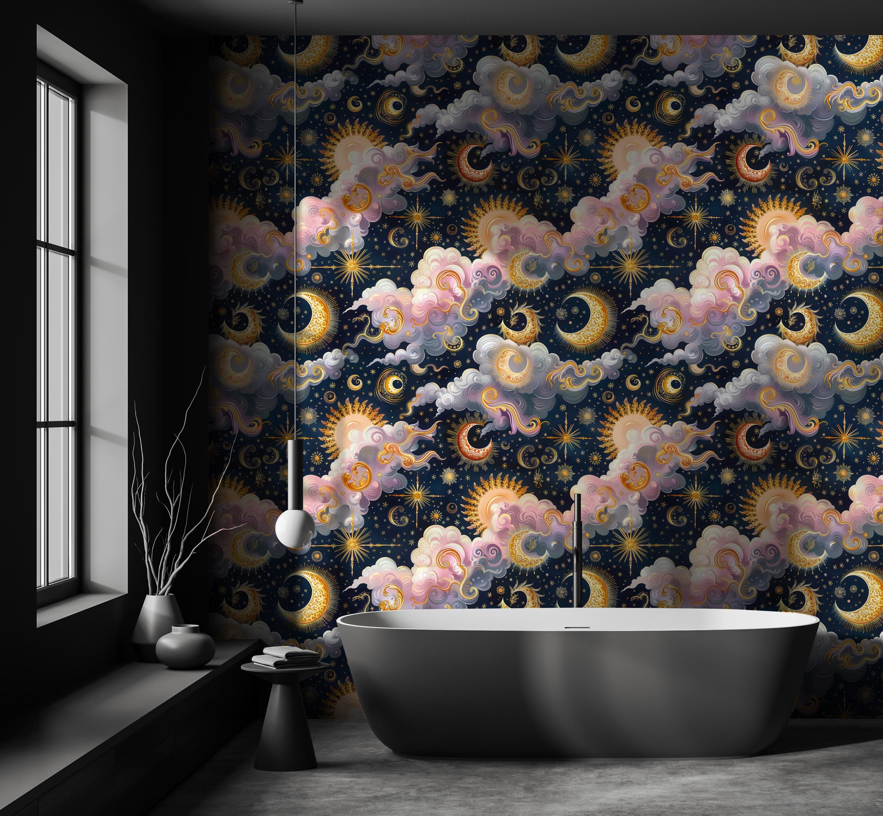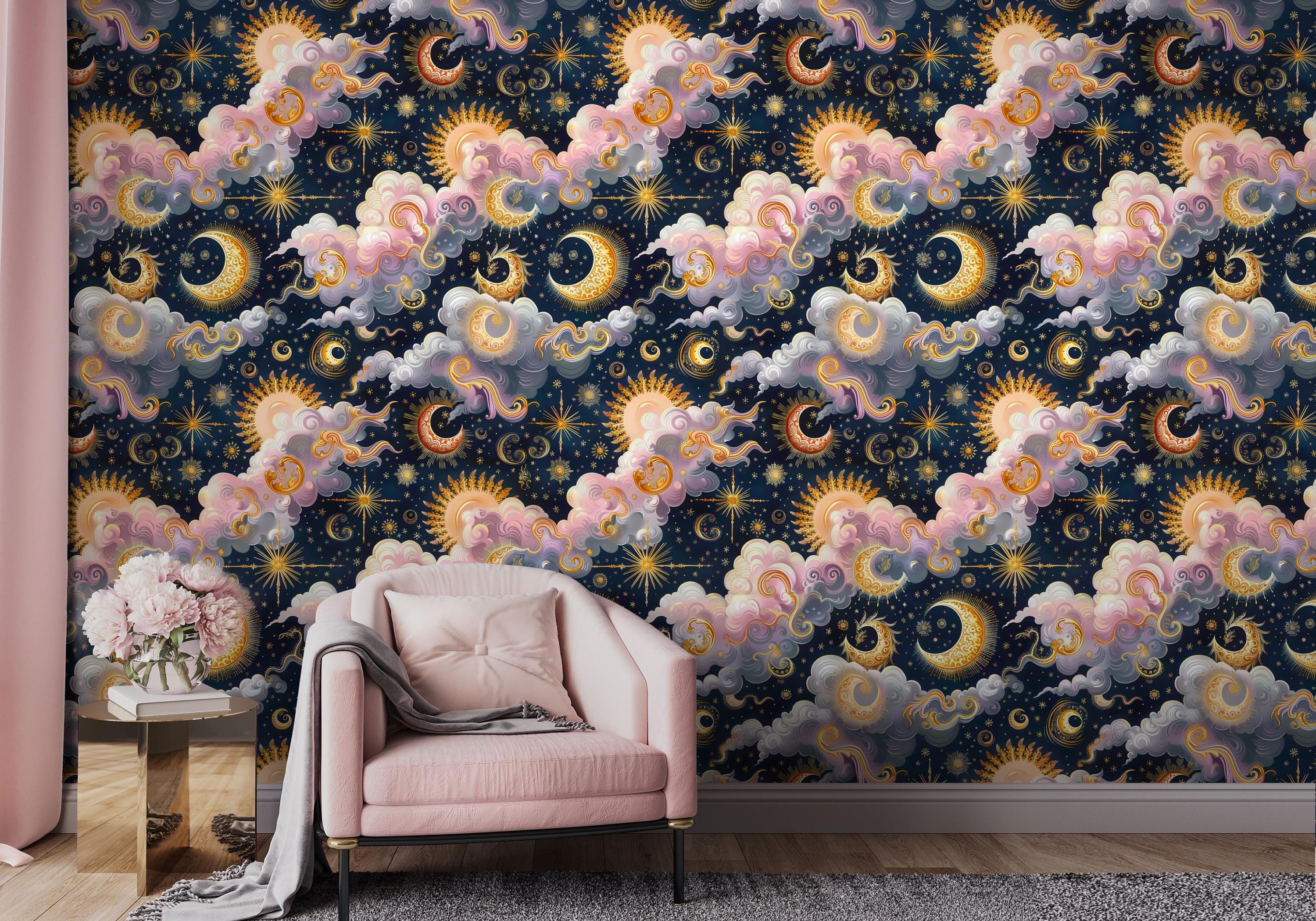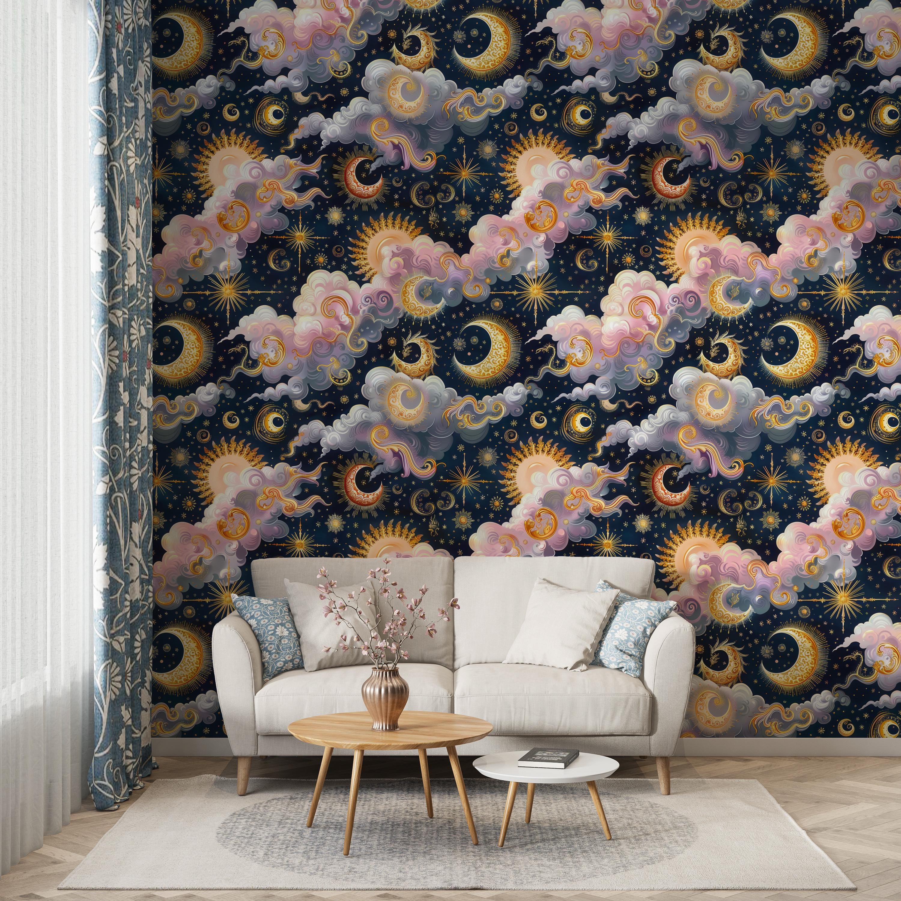 Featuring vibrant clouds, glowing suns, and golden moons, this design blends vintage astrology with a dreamy sky aesthetic. Perfect for creating a unique and eye-catching interior.
