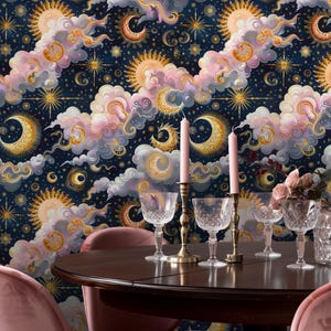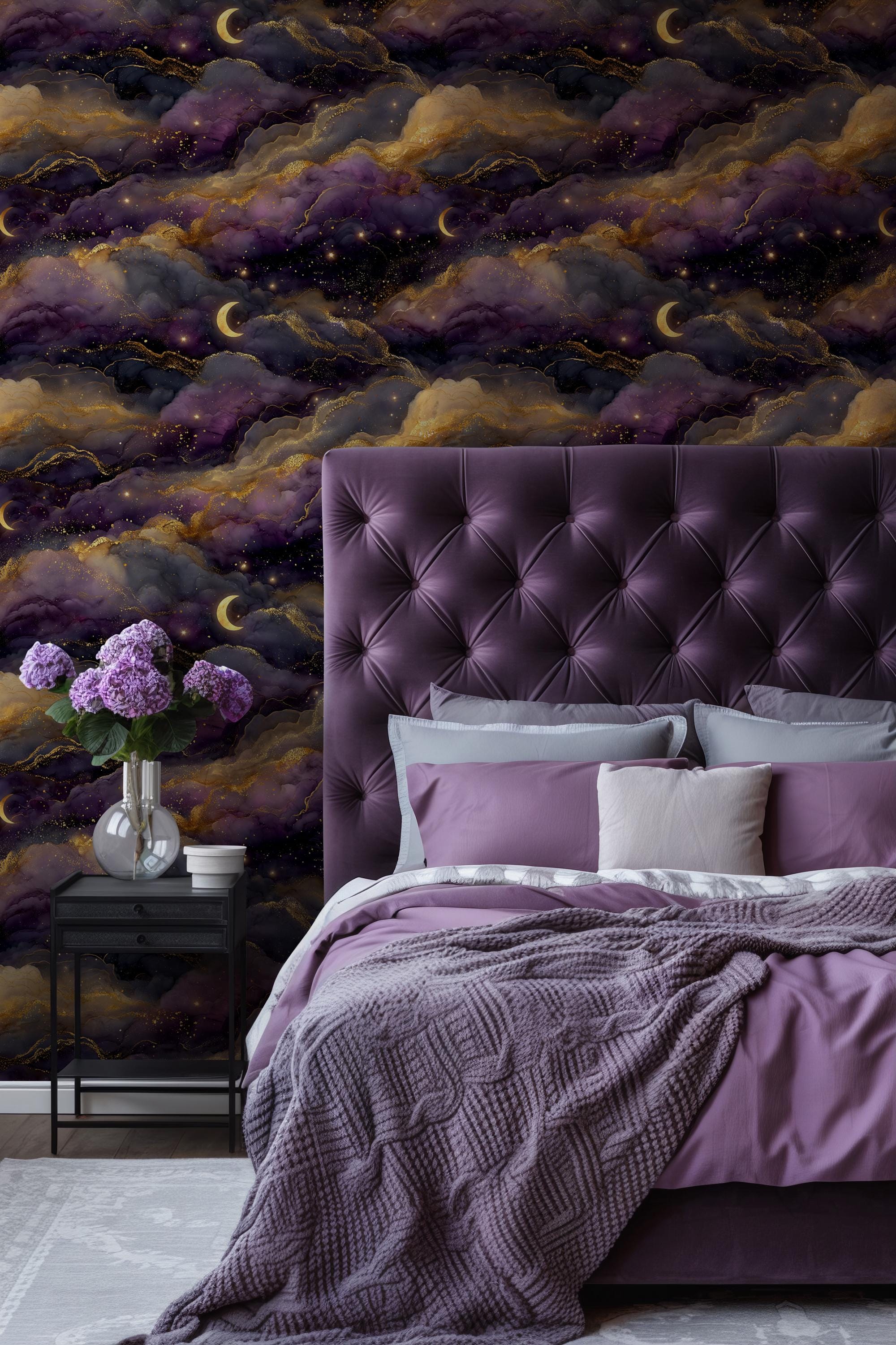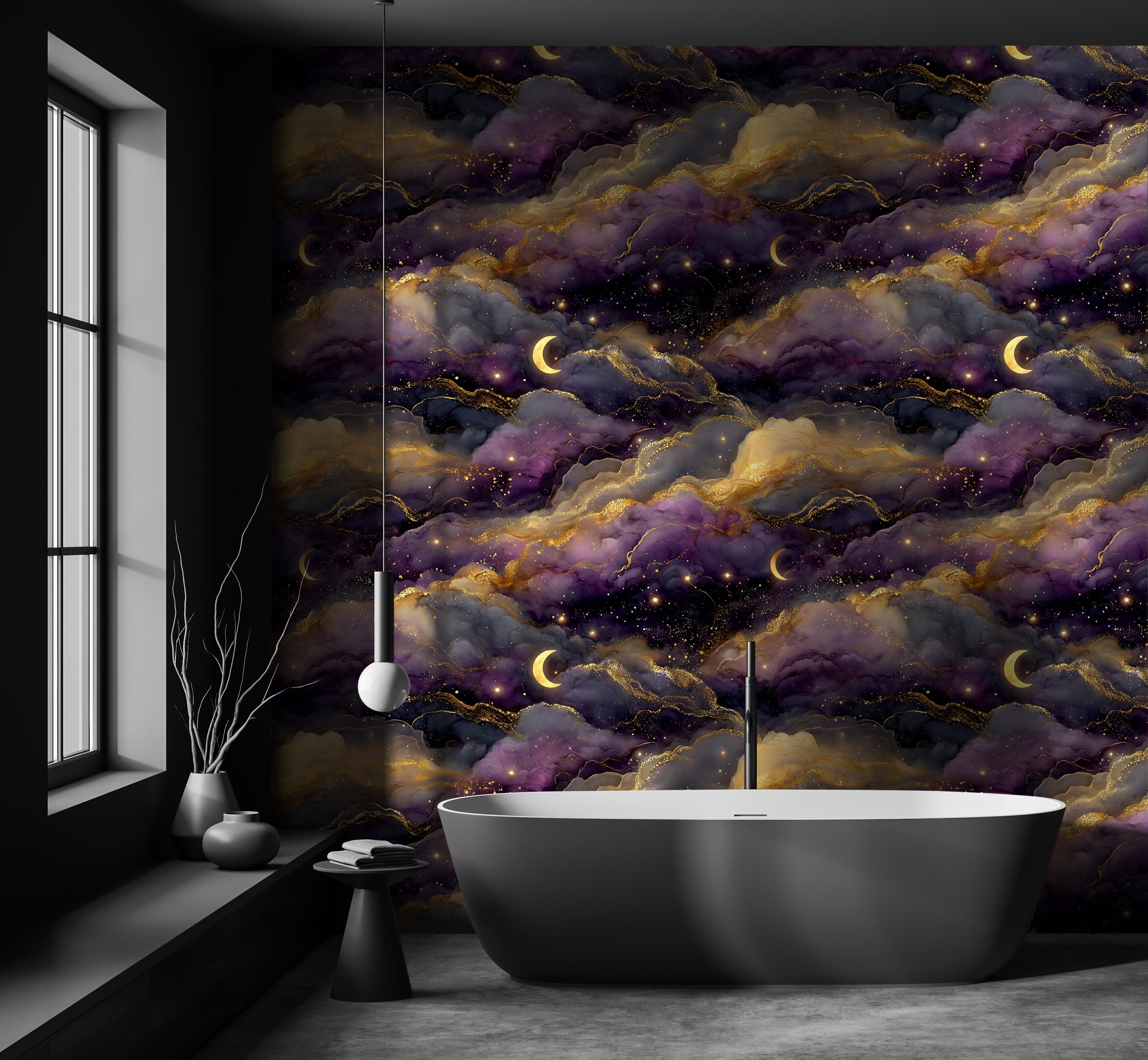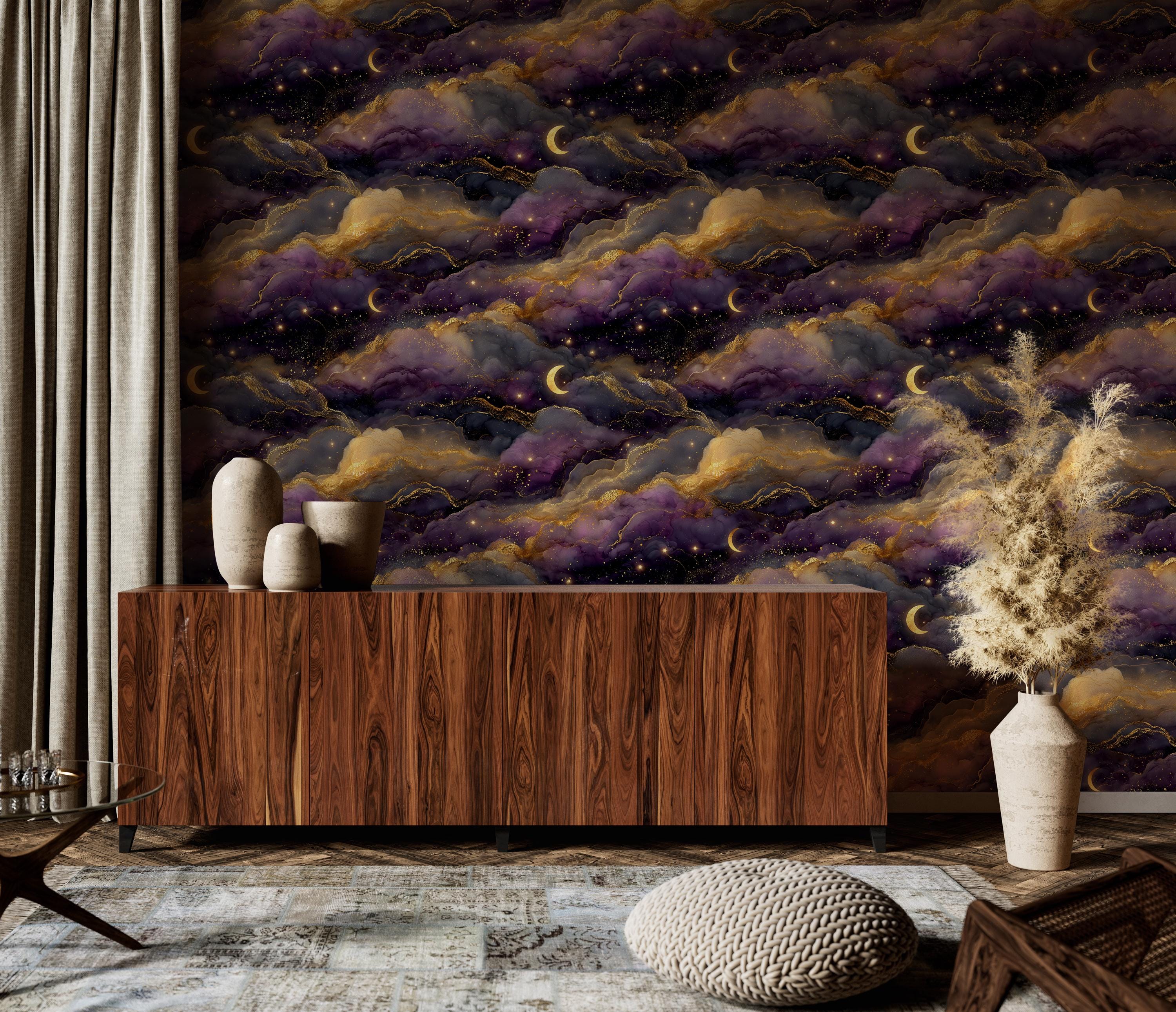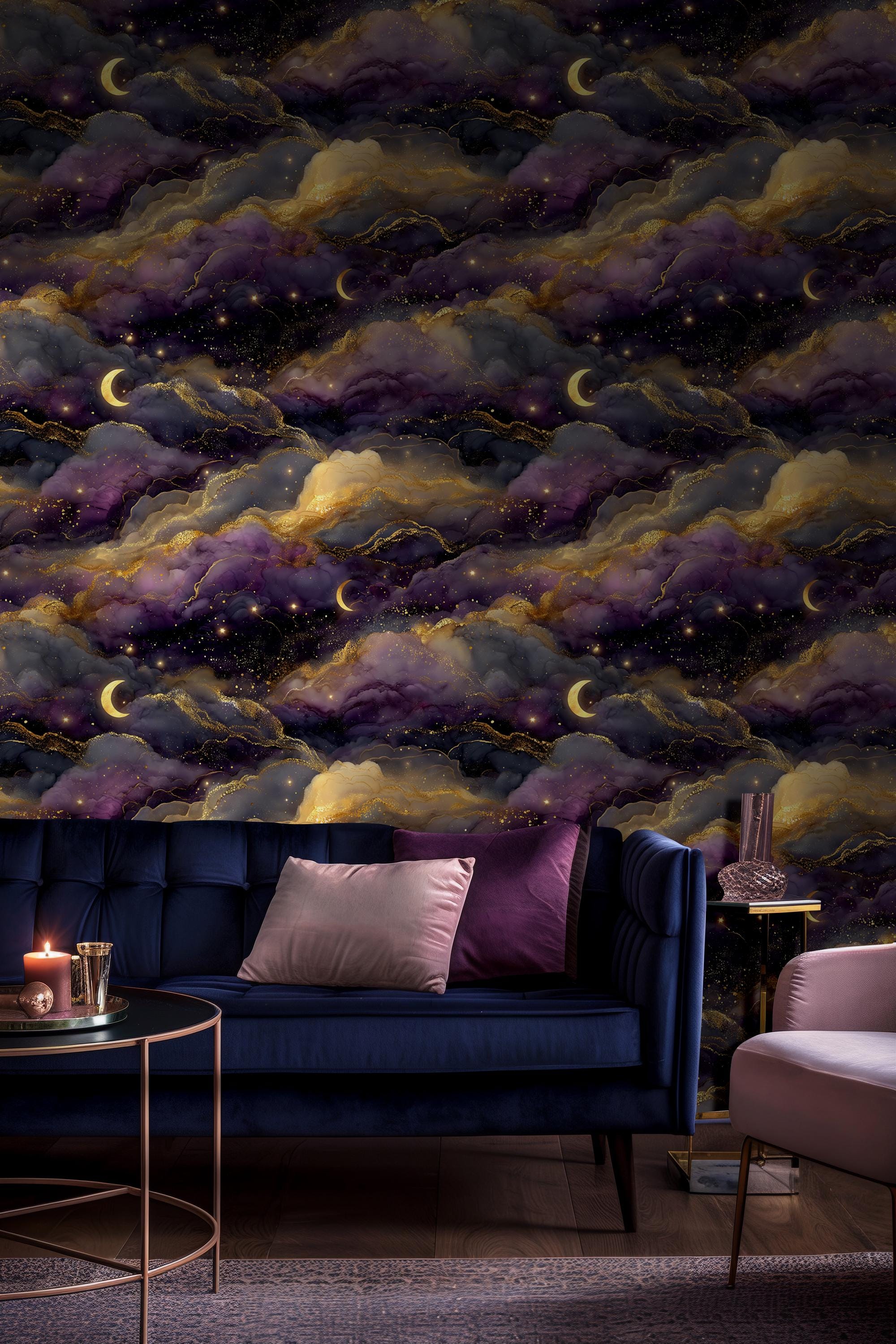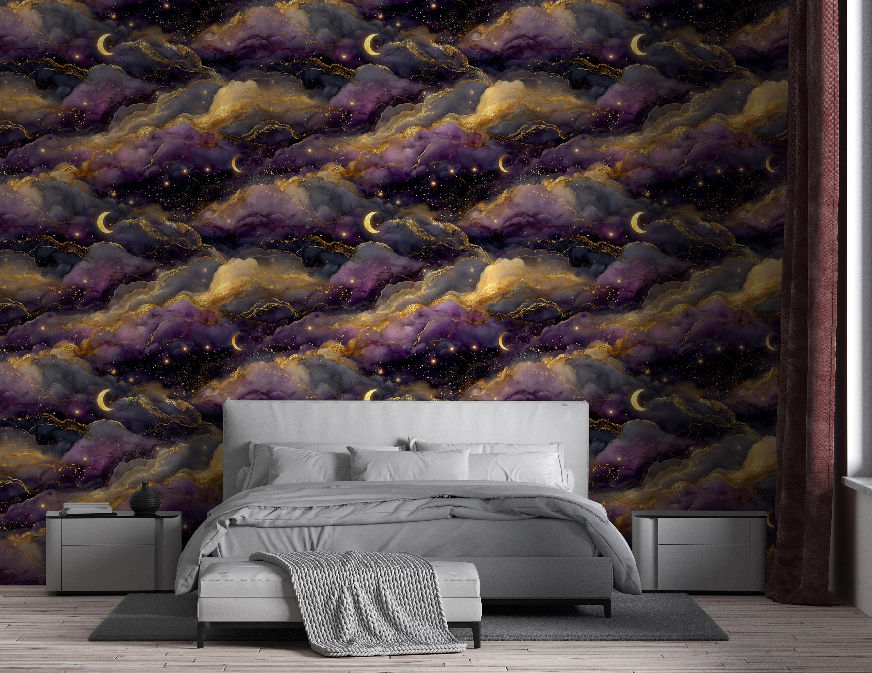 Featuring dreamy moonlit clouds and shimmering golden details, this design brings a mysterious and elegant night sky into your space. Perfect for creating a cozy, moody, and sophisticated interior.