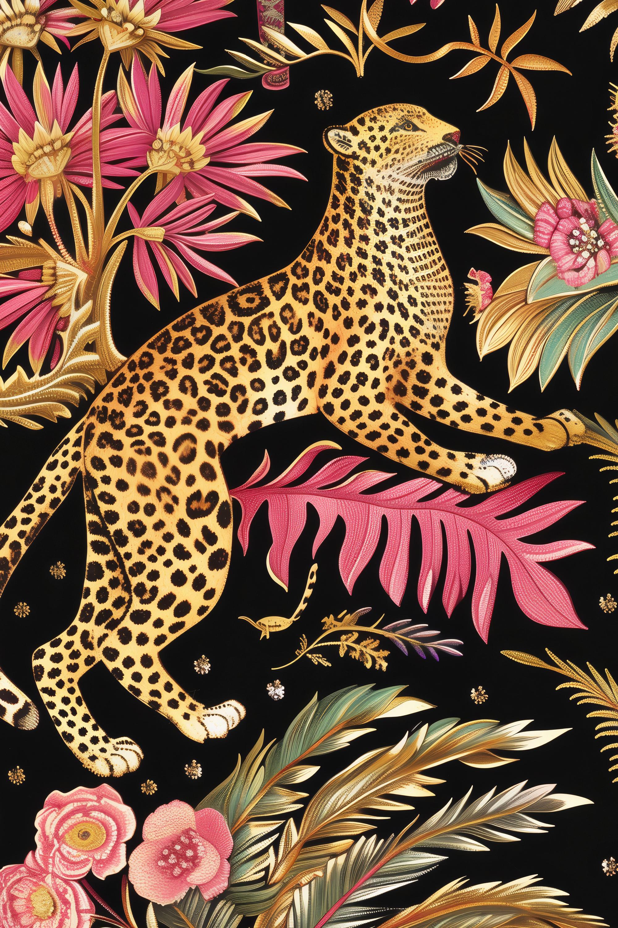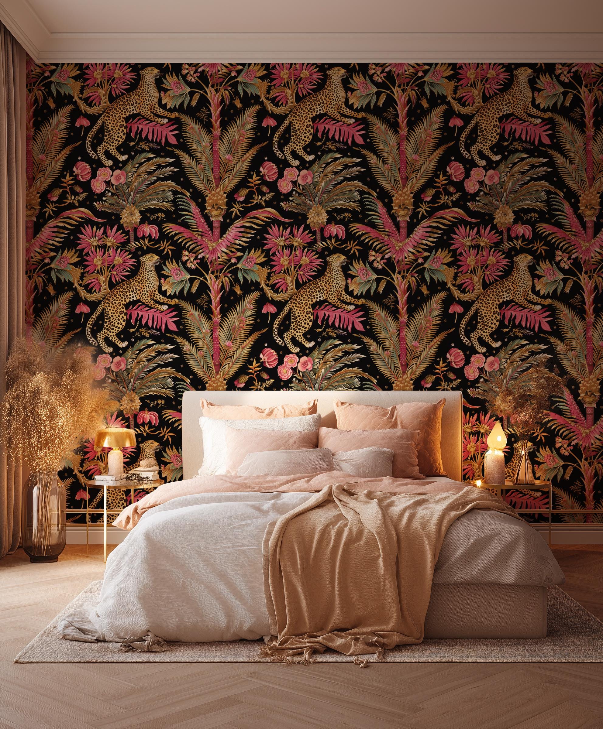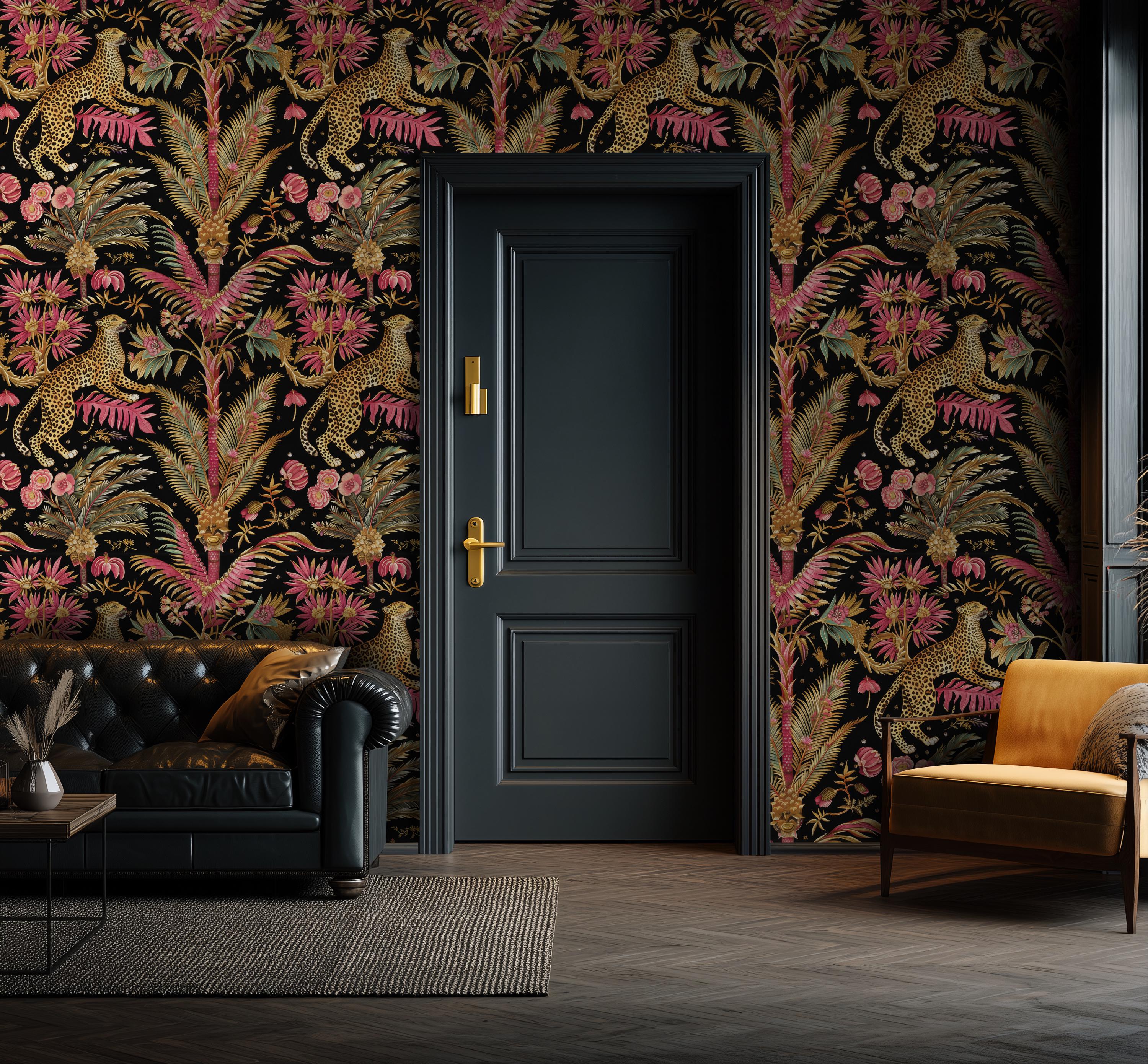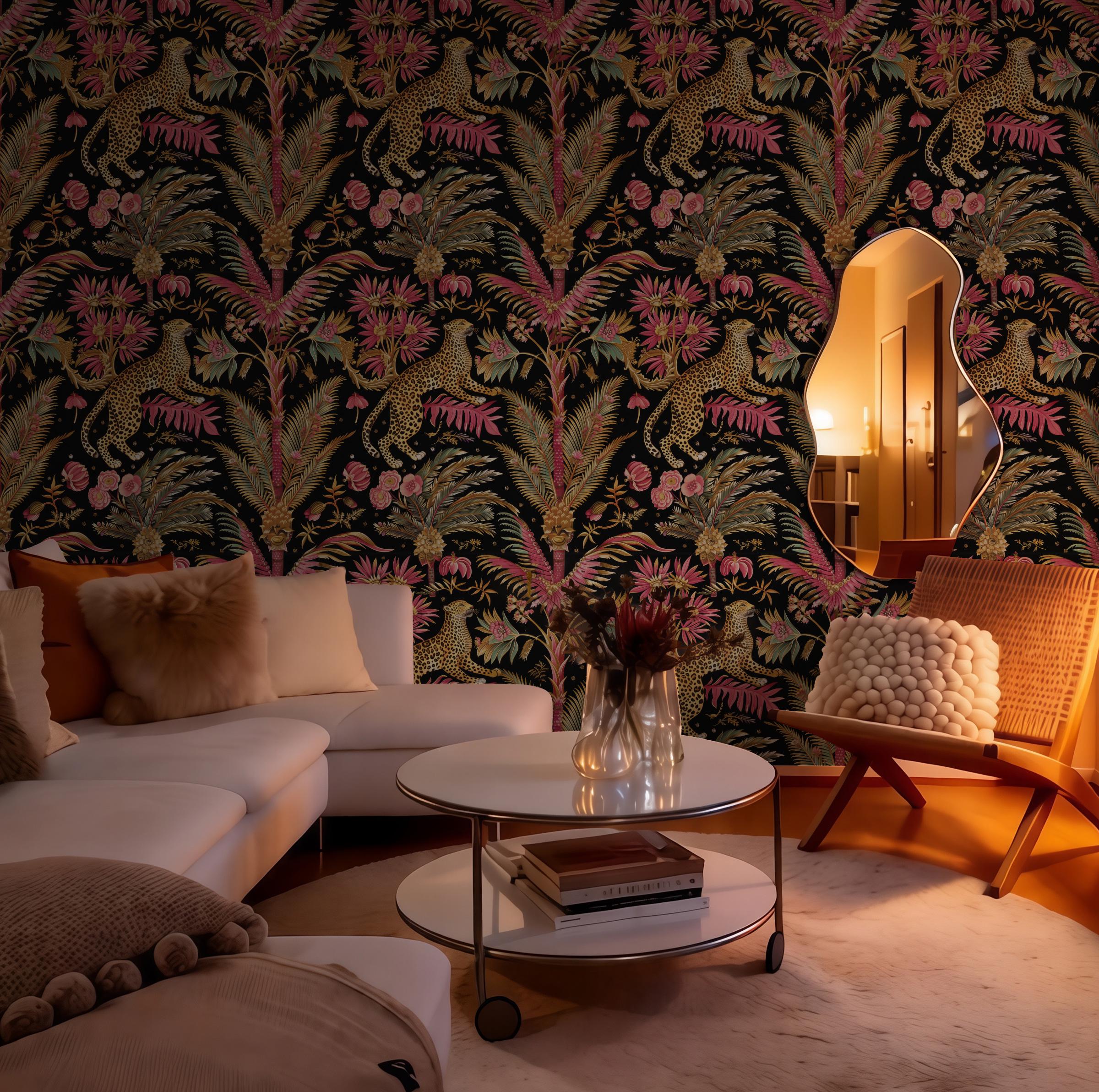 Bring bold elegance into your space with this leopard jungle wallpaper, featuring lush tropical florals and a dramatic dark background. This statement wall mural adds a luxurious and exotic feel to any room while maintaining a warm and stylish atmosphere.