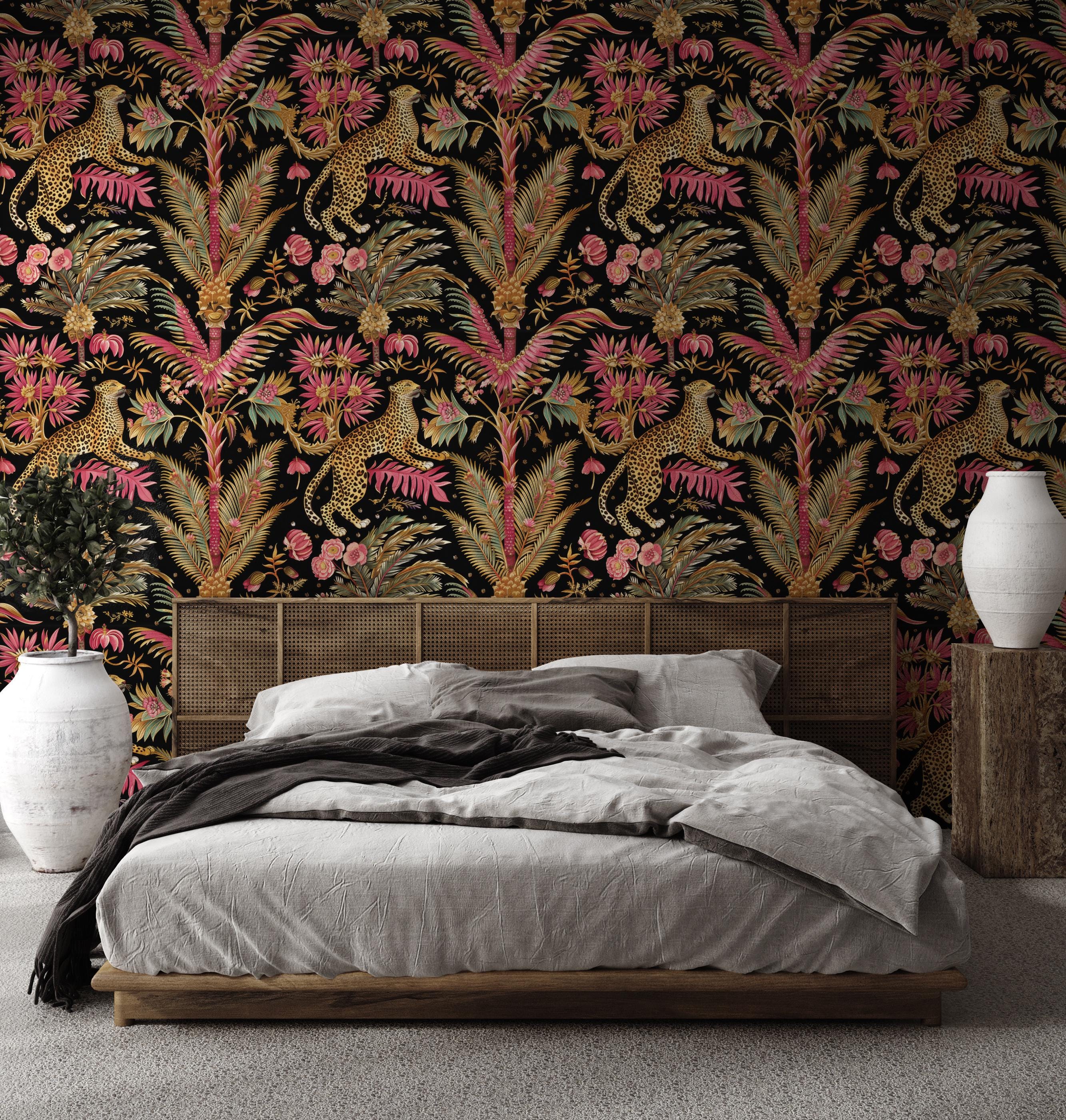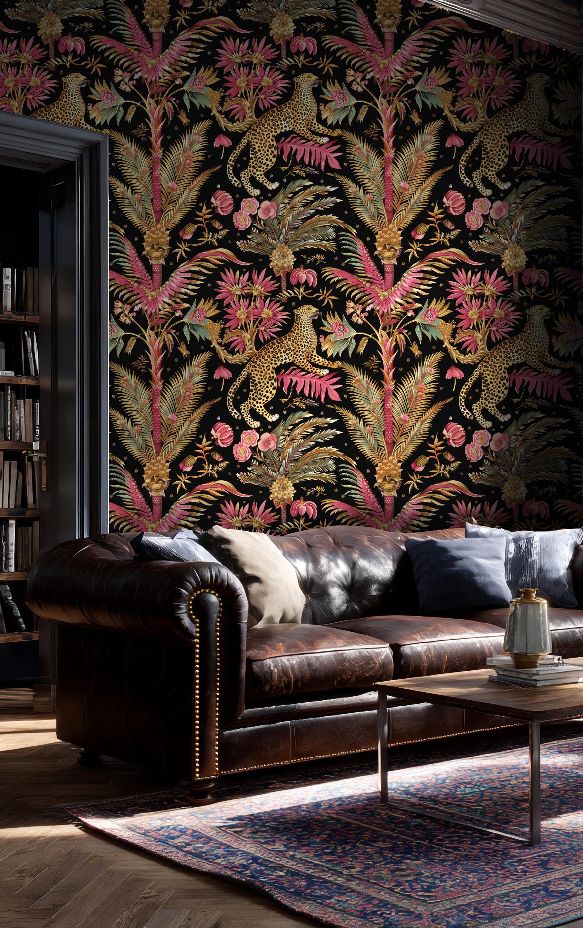 Leopard Jungle Wallpaper, Tropical Floral Wall Mural, Dark Botanical Peel and Stick Wallpaper