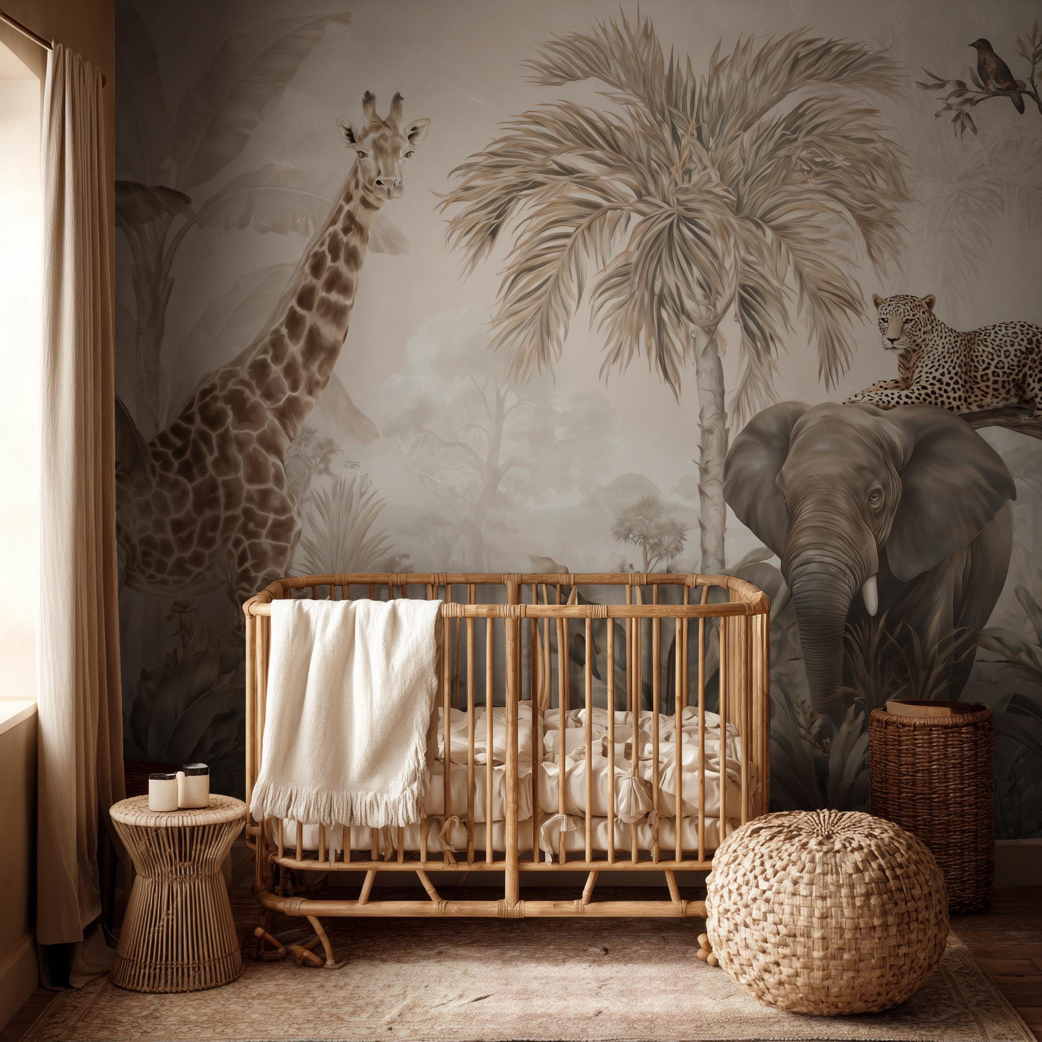 Neutral Jungle Animals Wallpaper, Safari Nursery Wall Mural, Giraffe Elephant Baby Room Decor