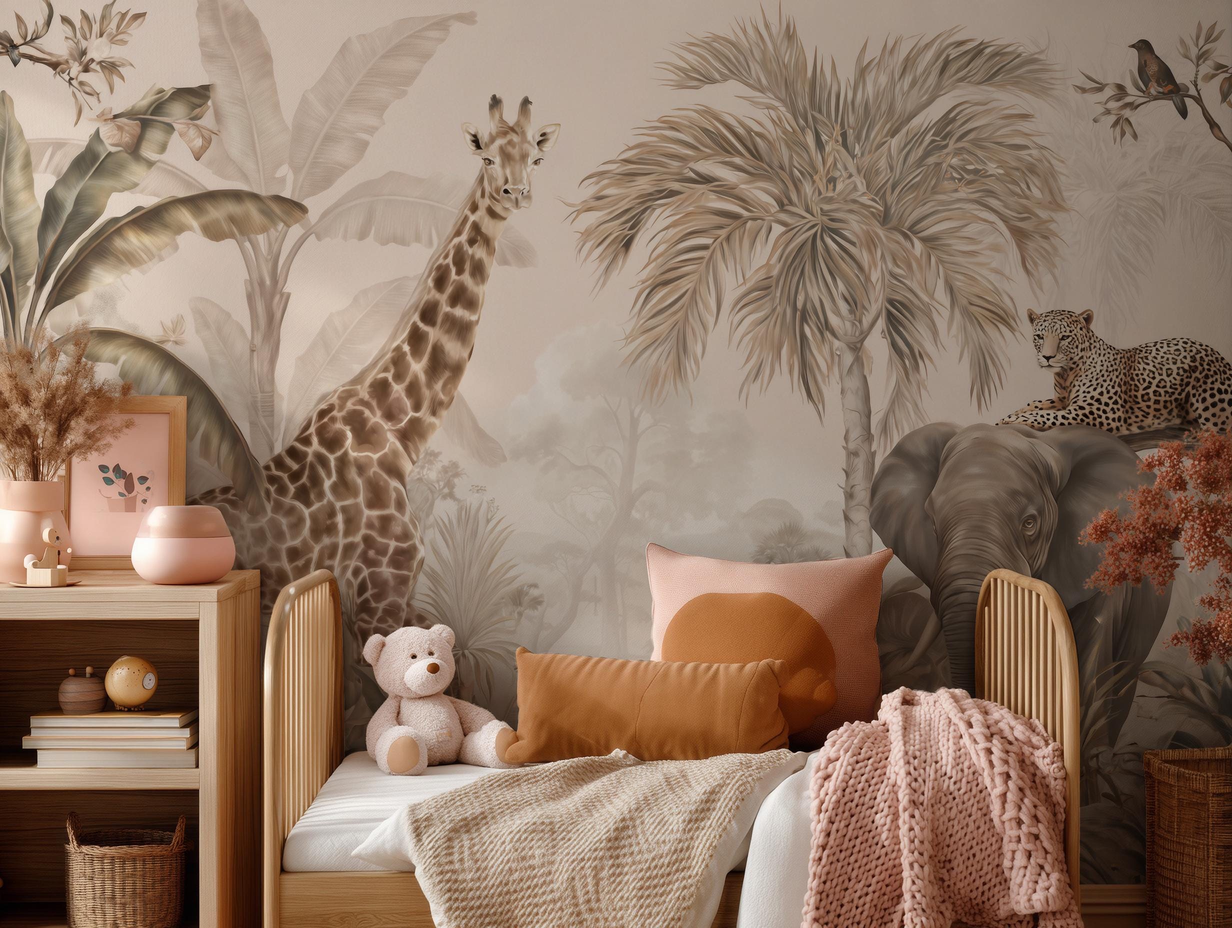 Perfect for nursery rooms, baby bedrooms, and kids’ spaces, this mural adds a timeless safari theme without overwhelming the room.