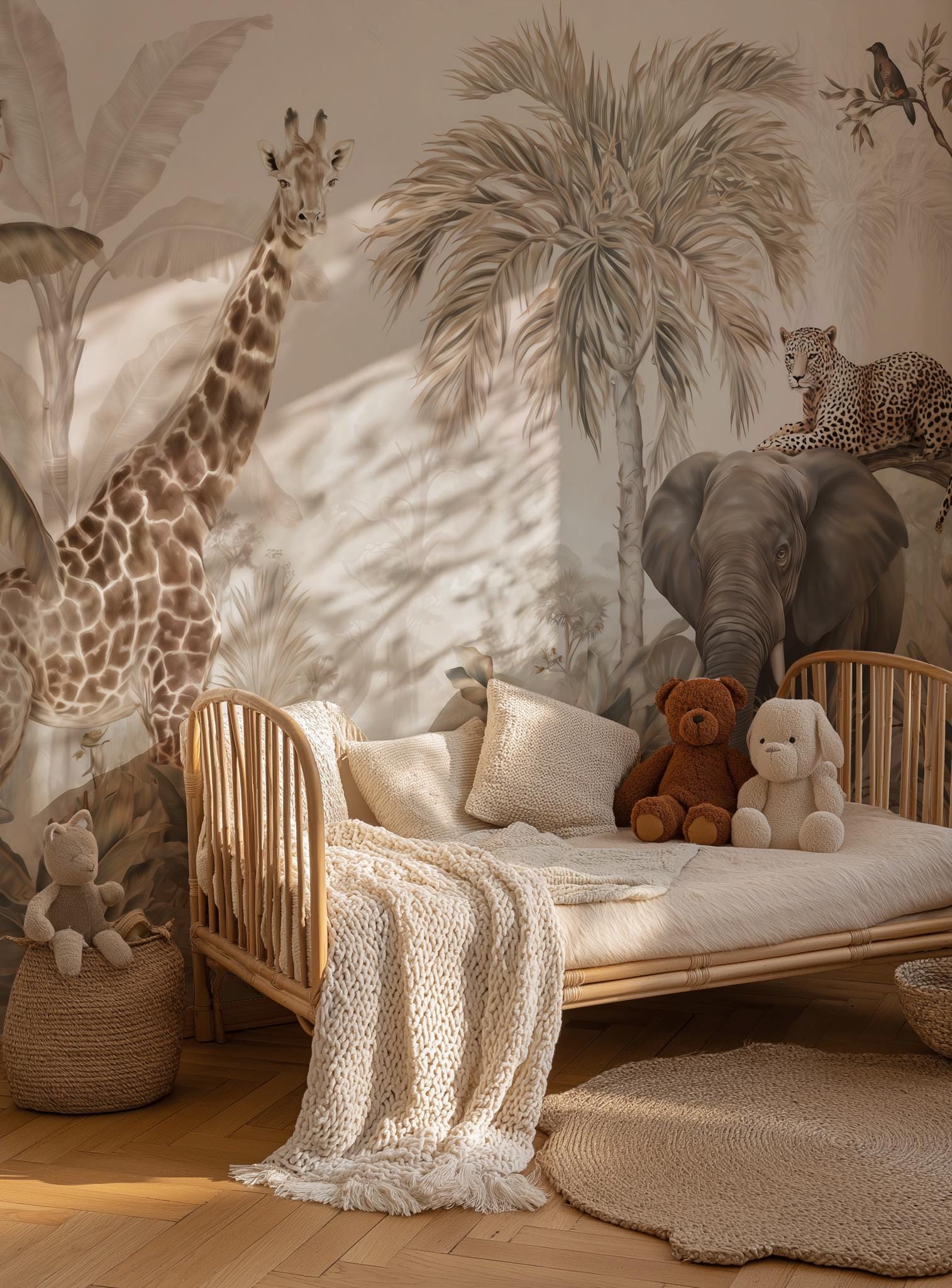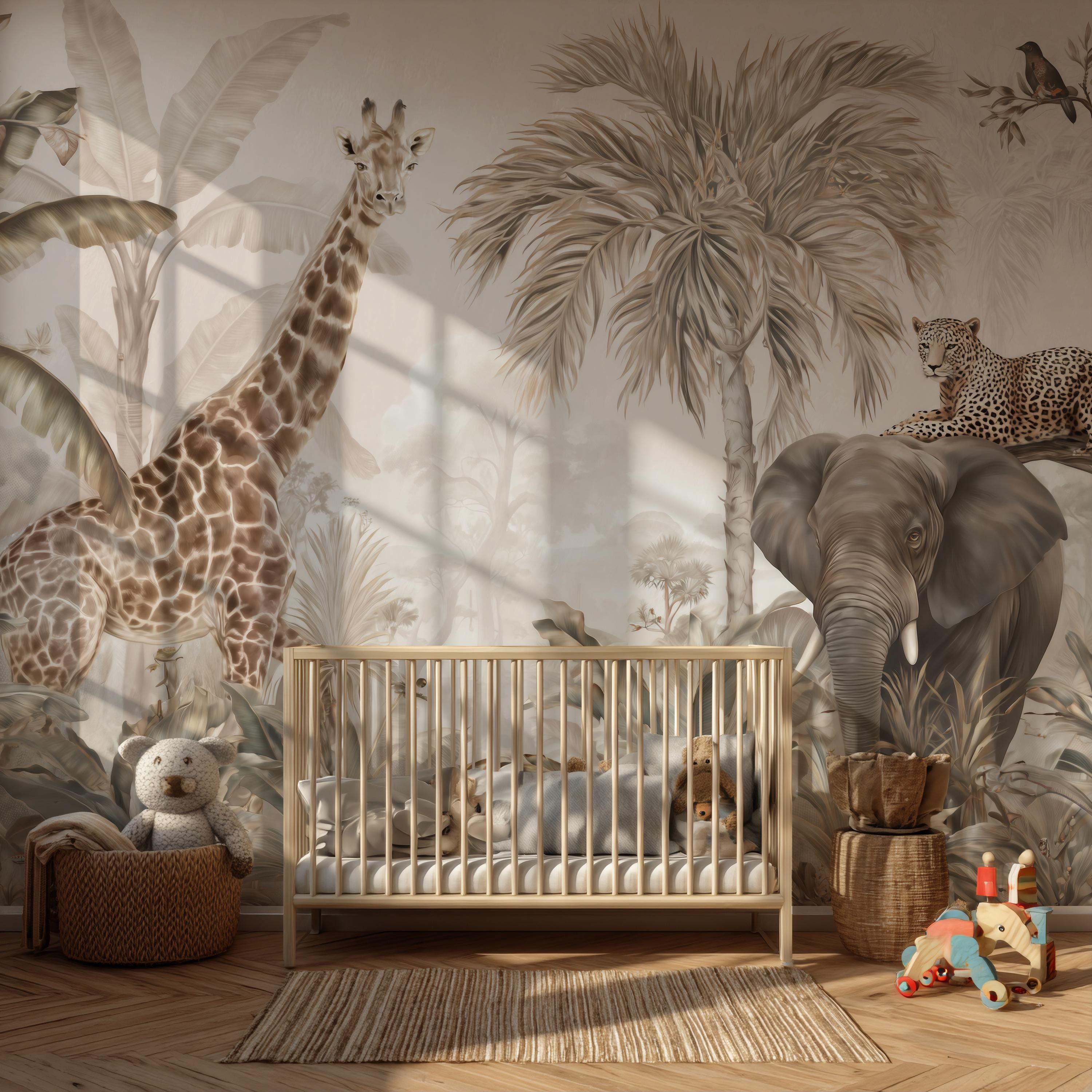 Create a calm and dreamy nursery with this neutral safari wall mural featuring a gentle giraffe, elephant, and jungle scenery. Designed in soft beige tones, this wallpaper brings warmth and elegance to your baby’s room while keeping a peaceful and modern look.