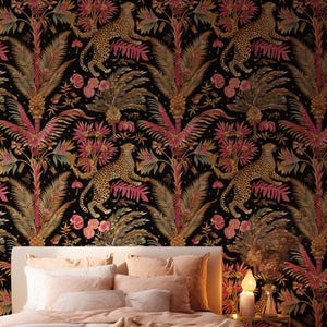 This design blends vintage botanical elements with a dramatic color palette, making it an ideal choice for bedrooms, living rooms, or statement walls.