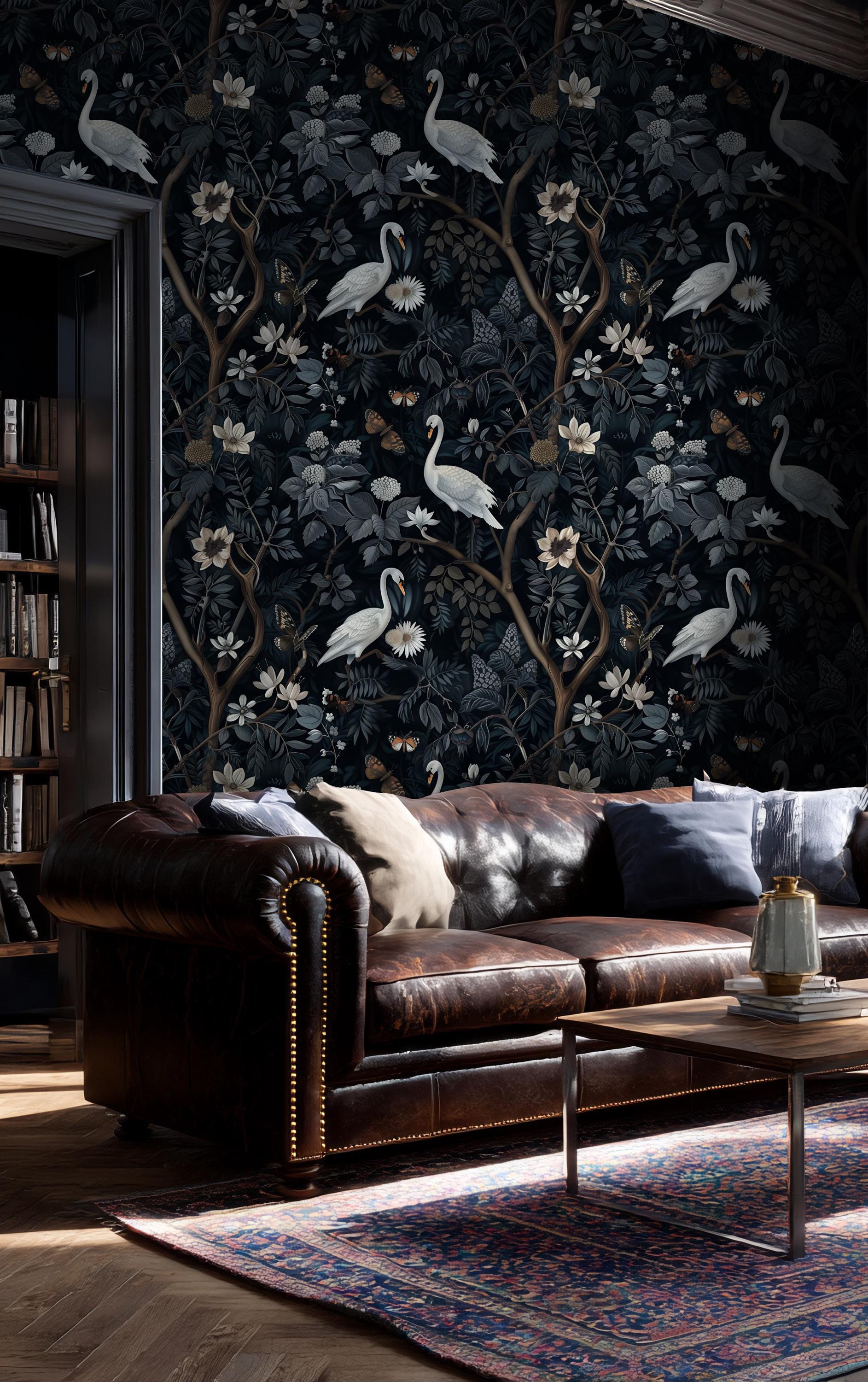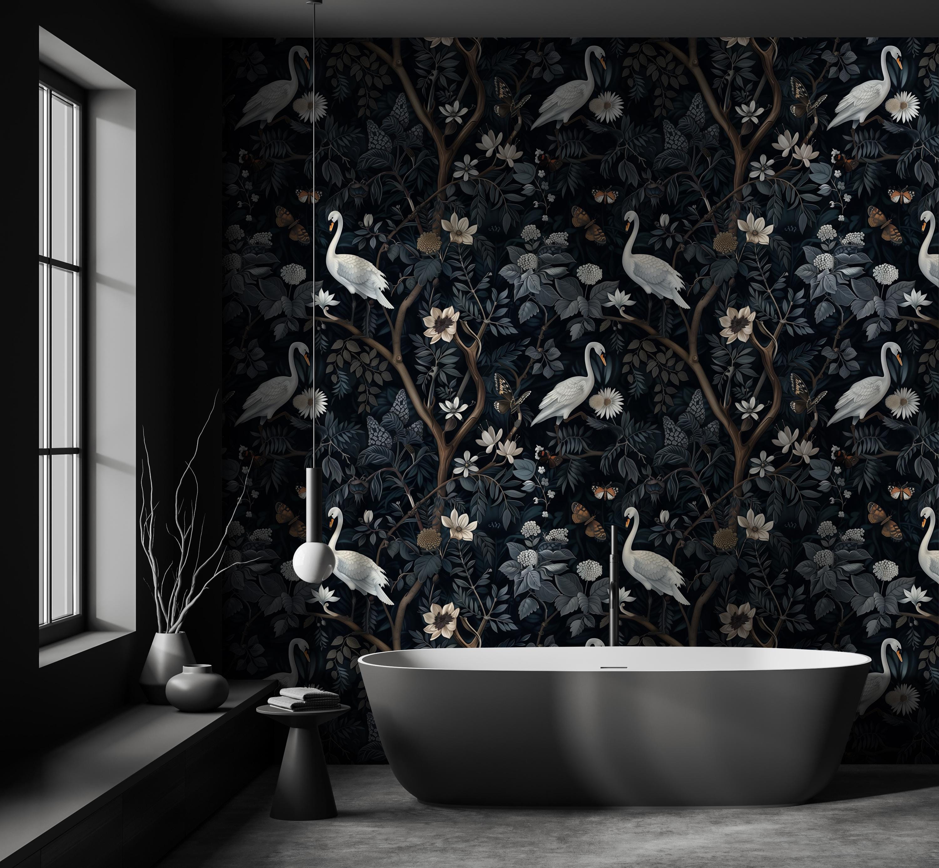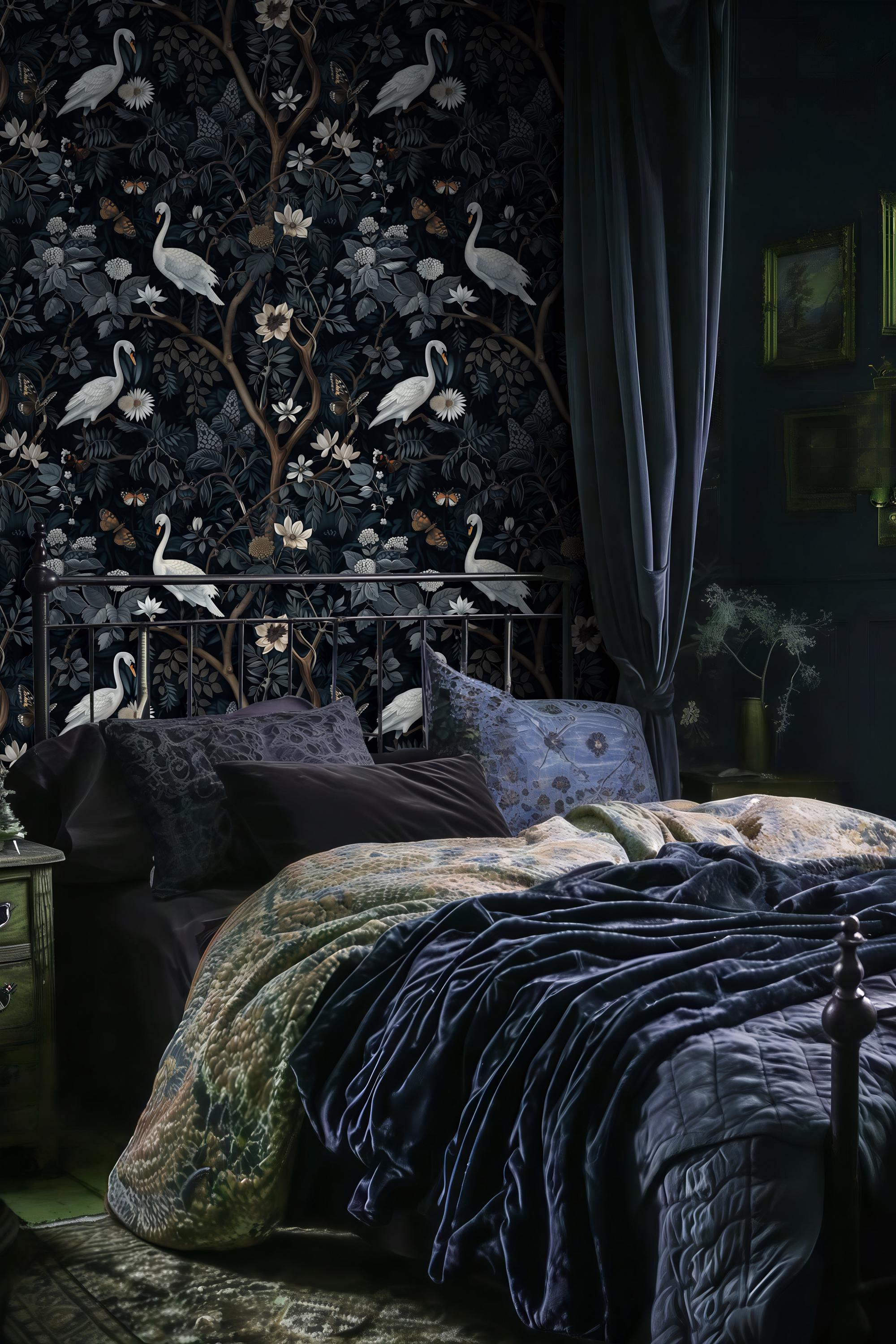 Bring depth and elegance into your space with this moody botanical swan wallpaper.