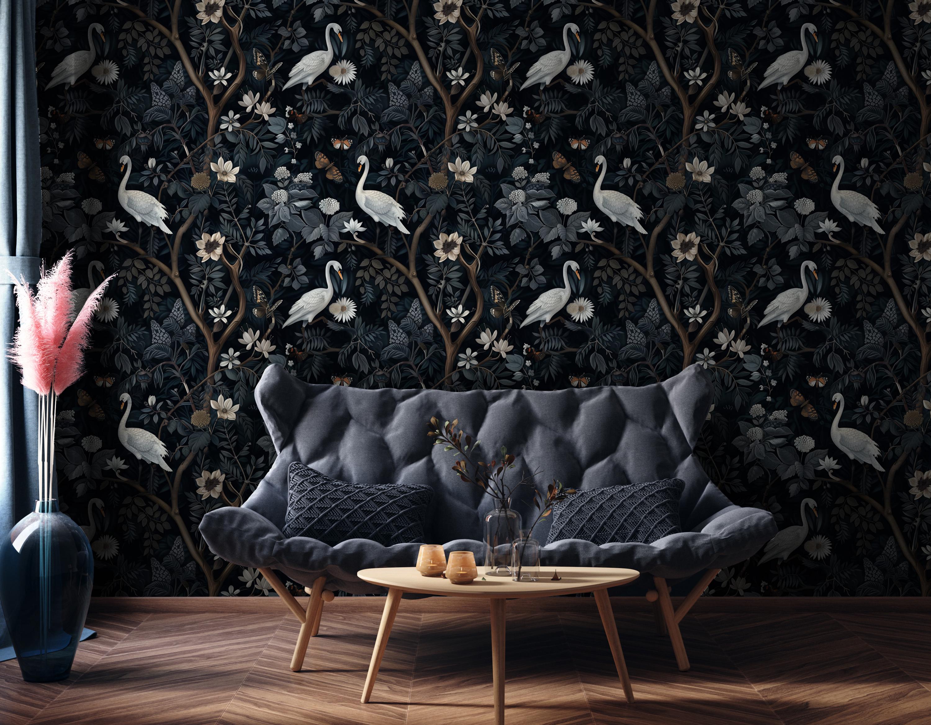 Designed with rich dark florals and graceful swans, this wall mural creates a sophisticated and atmospheric look perfect for modern interiors.
