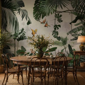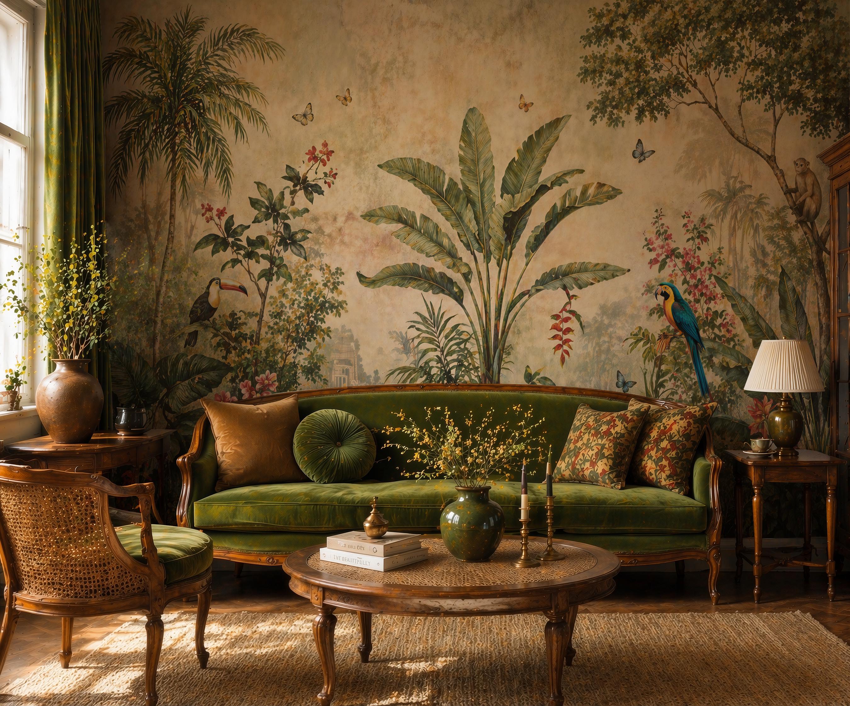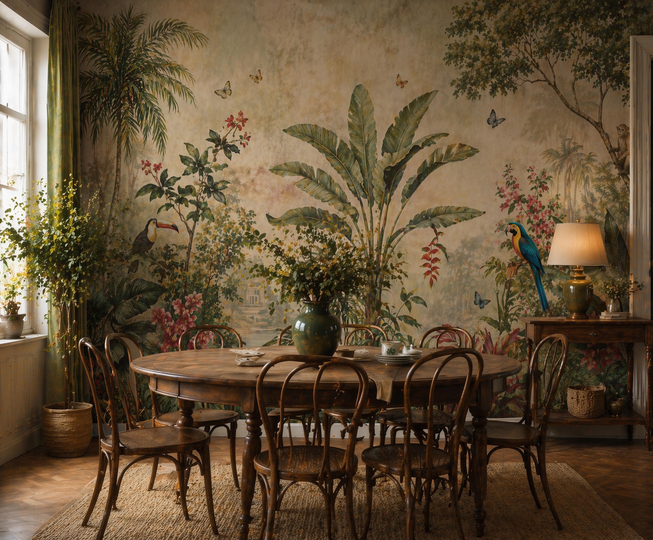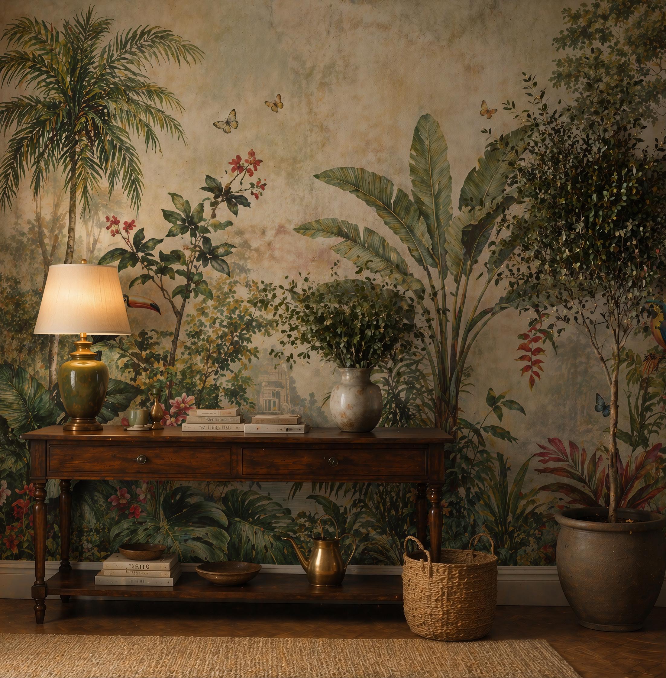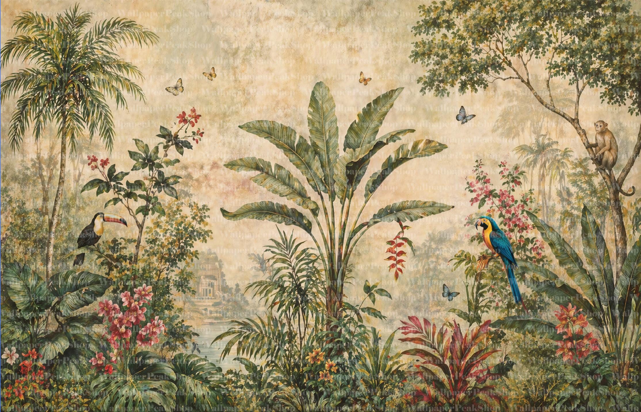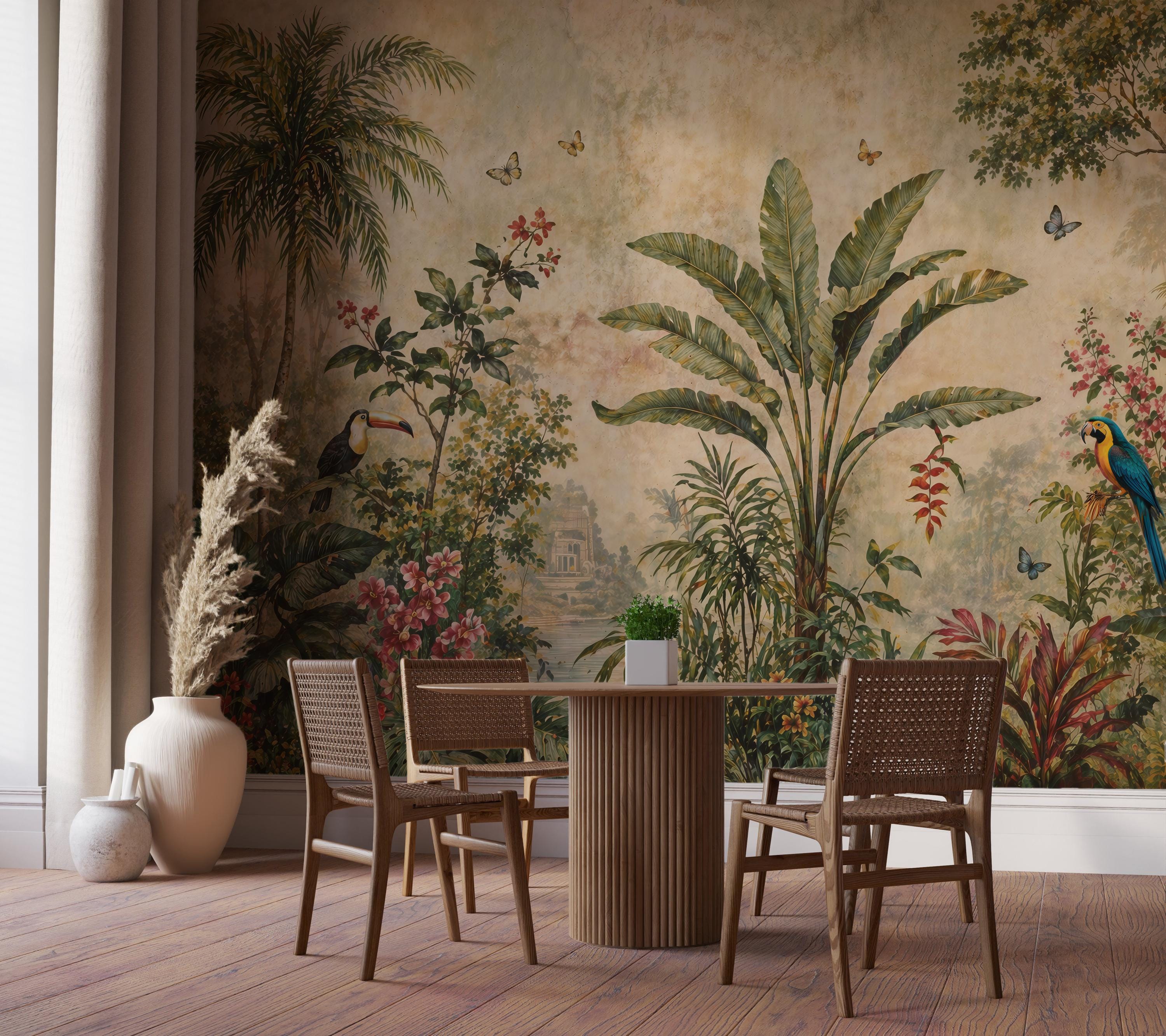 Bring timeless elegance into your home with this vintage tropical jungle wallpaper mural. Designed with lush botanical elements, exotic birds, and warm earthy tones, this piece transforms any space into a luxurious and artistic sanctuary.