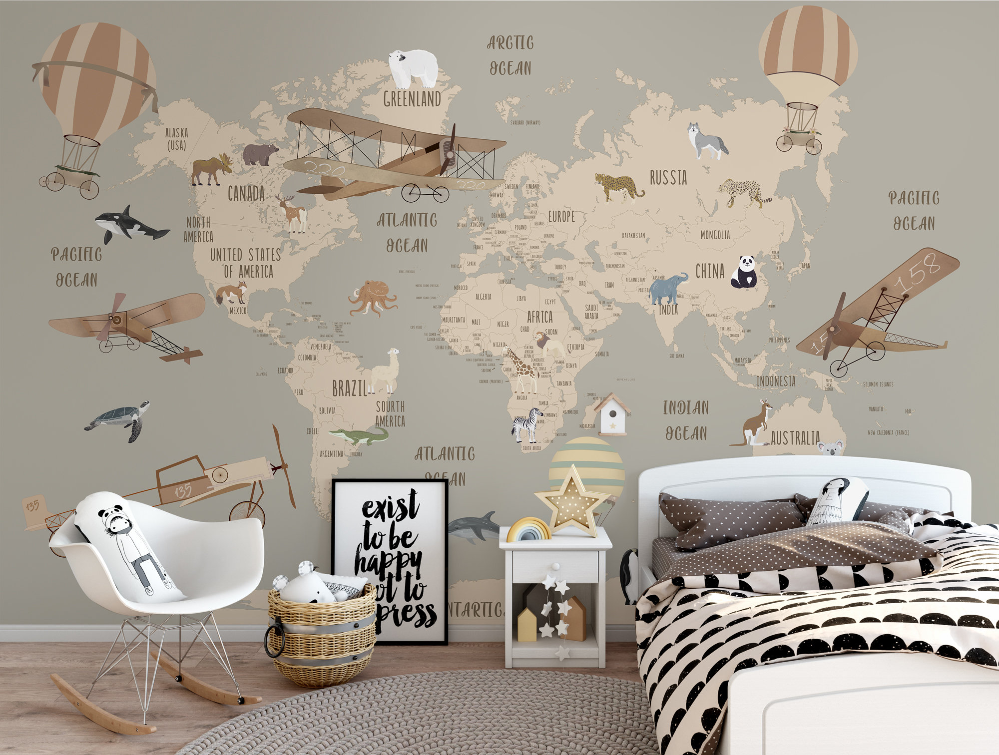 Ignite your child's curiosity and a love for the world with our charming animal-themed world map wallpaper! This engaging mural features a beautifully illustrated world map with adorable animals, continents, and oceans, making learning fun and interactive. Whimsical airplanes and hot air balloons add an element of adventure, inspiring your little one to dream of travel and exploration. It's the perfect choice for a nursery, kids' bedroom, or playroom, transforming any space into an exciting global adventure.