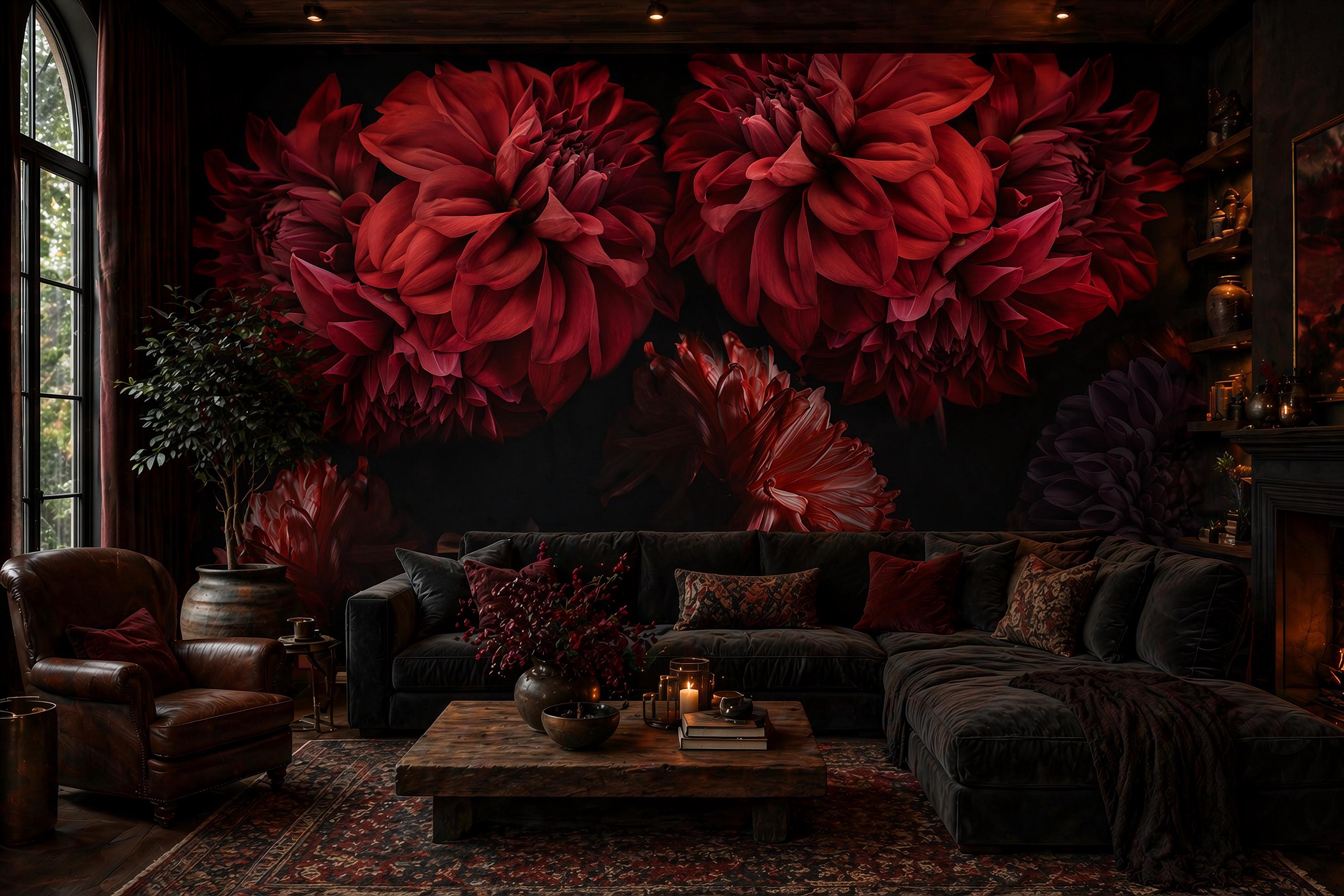 Transform your space into a dramatic and sophisticated sanctuary with our stunning dark floral wallpaper! This captivating mural features a lush array of large, vibrant red blooms in a bold artistic style set against a rich, dark background. The artistic, moody color palette and intricate details create a luxurious and powerful focal point for a bedroom, living room, or dining area.